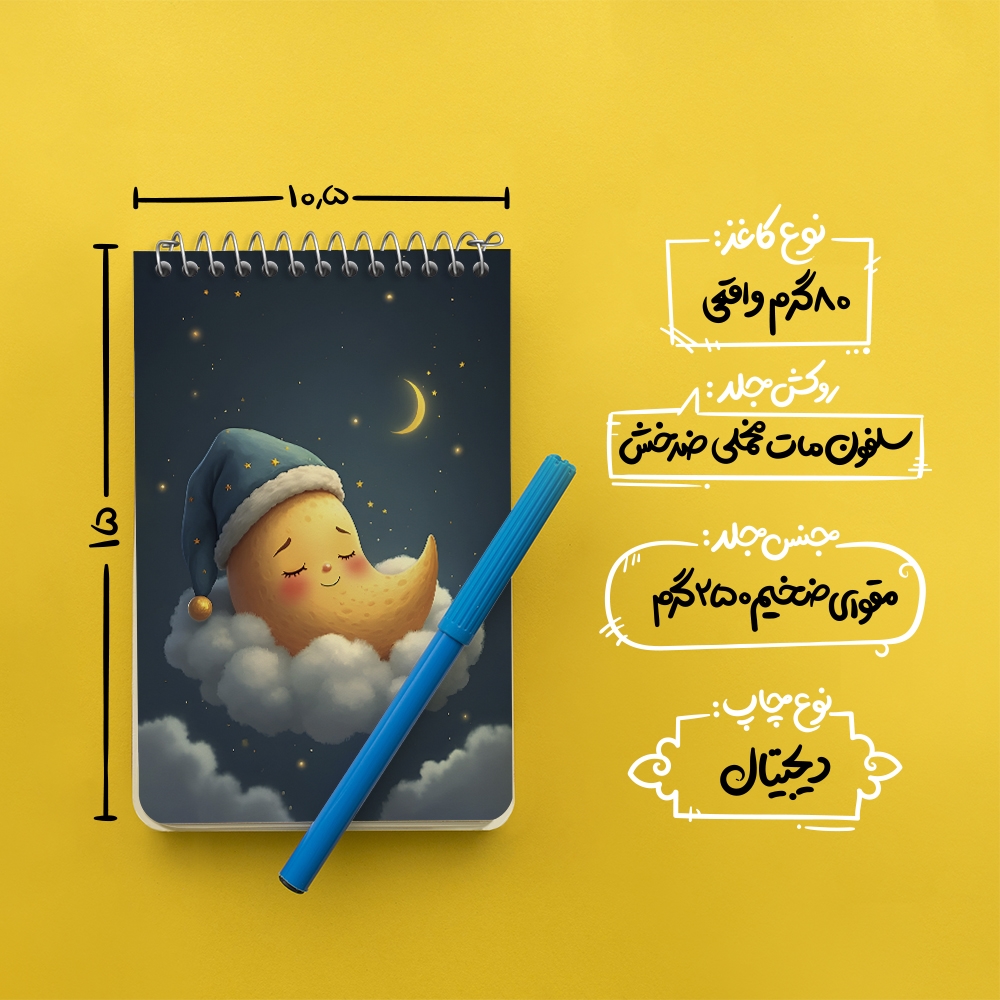 برند خندالو در زمینه تولید انواع دفاتر فانتزی و تحصیلی فعالیت میکند که به دلیل جذابیت ظاهری و طرح های متنوع طرفداران زیادی دارد. دفتر یادداشت خندالو طرح ماه کیوت محصولی مناسب برای همه عاشقان لوازم التحریر است و همچنین همه کسانی که بنا به موقعیت تحصیل یا شغلشان با دفتر و نوشت افزار زیاد سر و کار دارند. در تولید دفتر یادداشت خندالو طرح ماه کیوت از نوع صحافی فنر مارپیچ استفاده شده که در این نوع صحافی برگهها به راحتی چرخیده و یا بیرون آورده می شوند. دفتر های خندالو دارای جلد انعطاف پذیر از جنس مقوای گلاسه 250 گرم با روکش سلفون مات مخملی است که به شما امکان میدهد از دفتر خود بدون اینکه نگرانی از شکستن یا خراب شدن جلد را داشته باشید استفاده کنید و همچنین در این دفاتر از کاغذ 80 گرم با کیفیت استفاده شده که باعث میشود هنگام نوشتن به خوبی جوهر قلم بر روی صفحه نشسته و از خط خوردگیها جلوگیری کند. دفتر یادداشت خندالو با جنس و دوام مناسب، برگه های کاملاً سفید و خطوط طوسی دقیق را داراست که انسان را به نوشتن منظم و زیبا ترغیب میکند. طراحی کاملاً مناسب این دفاتر، به همراه کیفیت بالا، از آن یک محصول مورد علاقه و قابل اعتماد برای همه مقاطع تحصیلی میسازد. دفتر یادداشت خندالو طرح ماه کیوت انتخابی هوشمندانه و مناسب برای افرادی است که به دنبال دفتری با کیفیت و کاربرد عالی هستند. این دفتر، همراه خوبی برای شما در تمام مراحل تحصیل و کار خواهد بود و تجربهای لذتبخش از نوشتن و آموختن را به شما هدیه میدهد.