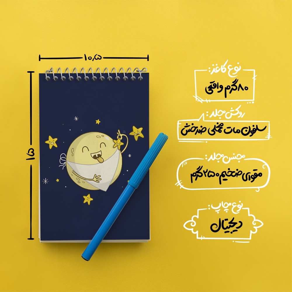 برند خندالو در زمینه تولید انواع دفاتر فانتزی و تحصیلی فعالیت میکند که به دلیل جذابیت ظاهری و طرح های متنوع طرفداران زیادی دارد. دفتر یادداشت خندالو طرح ماه محصولی مناسب برای همه عاشقان لوازم التحریر است و همچنین همه کسانی که بنا به موقعیت تحصیل یا شغلشان با دفتر و نوشت افزار زیاد سر و کار دارند. در تولید دفتر یادداشت خندالو طرح ماه از نوع صحافی فنر مارپیچ استفاده شده که در این نوع صحافی برگه‌ها به راحتی چرخیده و یا بیرون آورده می شوند.