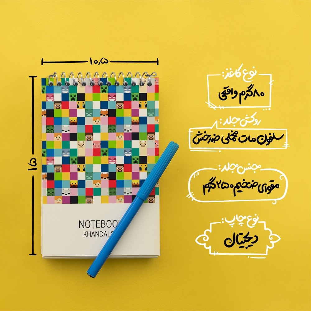 برند خندالو در زمینه تولید انواع دفاتر فانتزی و تحصیلی فعالیت میکند که به دلیل جذابیت ظاهری و طرح های متنوع طرفداران زیادی دارد. دفتر یادداشت خندالو طرح ماینکرافت (Minecraft) محصولی مناسب برای همه عاشقان لوازم التحریر است و همچنین همه کسانی که بنا به موقعیت تحصیل یا شغلشان با دفتر و نوشت افزار زیاد سر و کار دارند. در تولید دفتر یادداشت خندالو طرح ماینکرافت (Minecraft) از نوع صحافی فنر مارپیچ استفاده شده که در این نوع صحافی برگه‌ها به راحتی چرخیده و یا بیرون آورده می شوند.