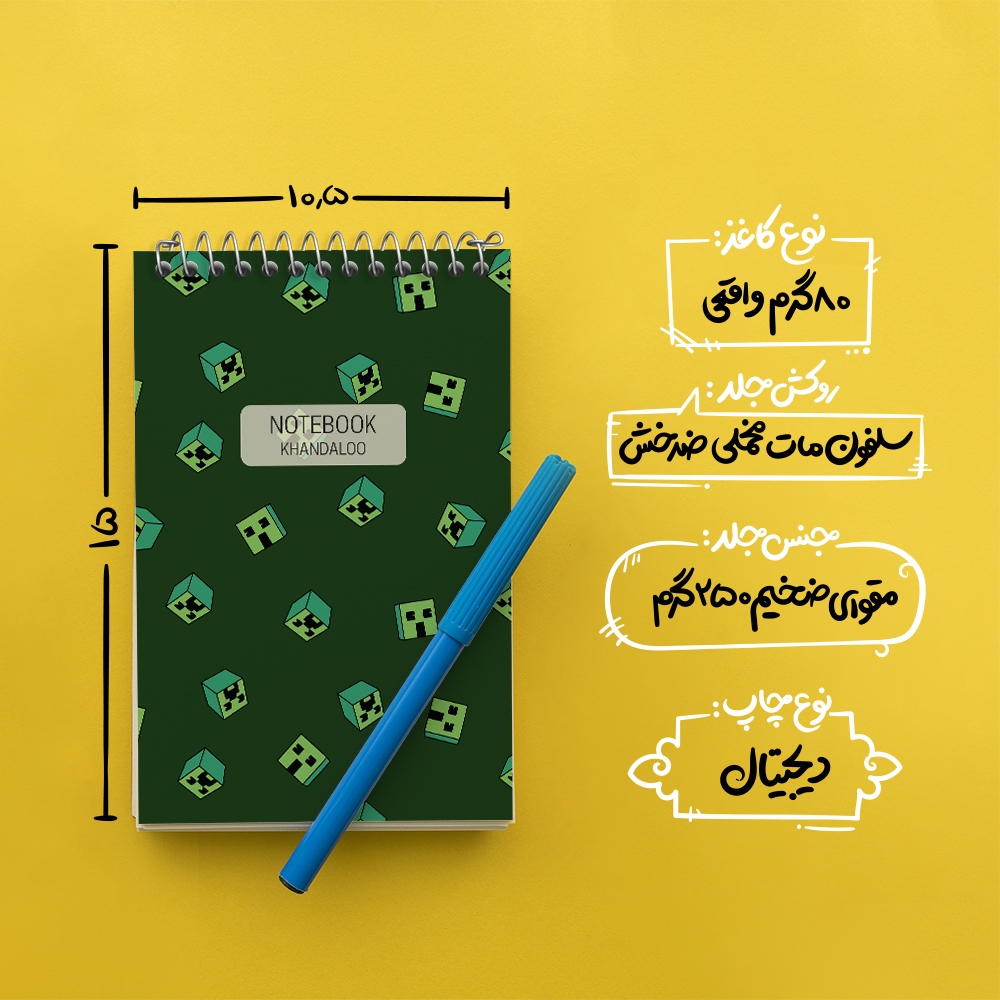 برند خندالو در زمینه تولید انواع دفاتر فانتزی و تحصیلی فعالیت میکند که به دلیل جذابیت ظاهری و طرح های متنوع طرفداران زیادی دارد. دفتر یادداشت خندالو طرح ماینکرافت (Minecraft) محصولی مناسب برای همه عاشقان لوازم التحریر است و همچنین همه کسانی که بنا به موقعیت تحصیل یا شغلشان با دفتر و نوشت افزار زیاد سر و کار دارند. در تولید دفتر یادداشت خندالو طرح ماینکرافت (Minecraft) از نوع صحافی فنر مارپیچ استفاده شده که در این نوع صحافی برگه‌ها به راحتی چرخیده و یا بیرون آورده می شوند.