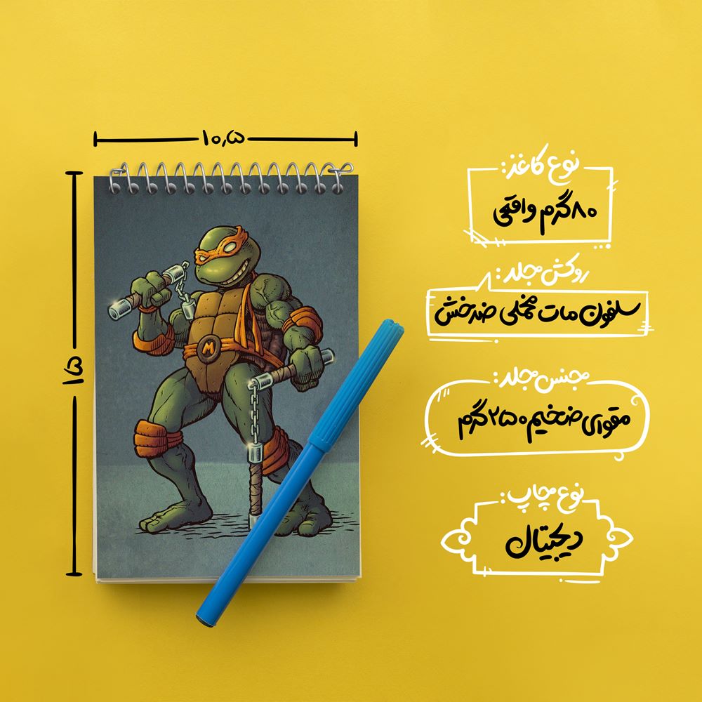 برند خندالو در زمینه تولید انواع دفاتر فانتزی و تحصیلی فعالیت میکند که به دلیل جذابیت ظاهری و طرح های متنوع طرفداران زیادی دارد. دفتر یادداشت خندالو طرح مایکل آنجلو لاکپشت های نینجا محصولی مناسب برای همه عاشقان لوازم التحریر است و همچنین همه کسانی که بنا به موقعیت تحصیل یا شغلشان با دفتر و نوشت افزار زیاد سر و کار دارند. در تولید دفتر یادداشت خندالو طرح مایکل آنجلو لاکپشت های نینجا از نوع صحافی فنر مارپیچ استفاده شده که در این نوع صحافی برگهها به راحتی چرخیده و یا بیرون آورده می شوند. دفتر های خندالو دارای جلد انعطاف پذیر از جنس مقوای گلاسه 250 گرم با روکش سلفون مات مخملی است که به شما امکان میدهد از دفتر خود بدون اینکه نگرانی از شکستن یا خراب شدن جلد را داشته باشید استفاده کنید و همچنین در این دفاتر از کاغذ 80 گرم با کیفیت استفاده شده که باعث میشود هنگام نوشتن به خوبی جوهر قلم بر روی صفحه نشسته و از خط خوردگیها جلوگیری کند. دفتر یادداشت خندالو با جنس و دوام مناسب، برگه های کاملاً سفید و خطوط طوسی دقیق را داراست که انسان را به نوشتن منظم و زیبا ترغیب میکند. طراحی کاملاً مناسب این دفاتر، به همراه کیفیت بالا، از آن یک محصول مورد علاقه و قابل اعتماد برای همه مقاطع تحصیلی میسازد. دفتر یادداشت خندالو طرح مایکل آنجلو لاکپشت های نینجا انتخابی هوشمندانه و مناسب برای افرادی است که به دنبال دفتری با کیفیت و کاربرد عالی هستند. این دفتر، همراه خوبی برای شما در تمام مراحل تحصیل و کار خواهد بود و تجربهای لذتبخش از نوشتن و آموختن را به شما هدیه میدهد.