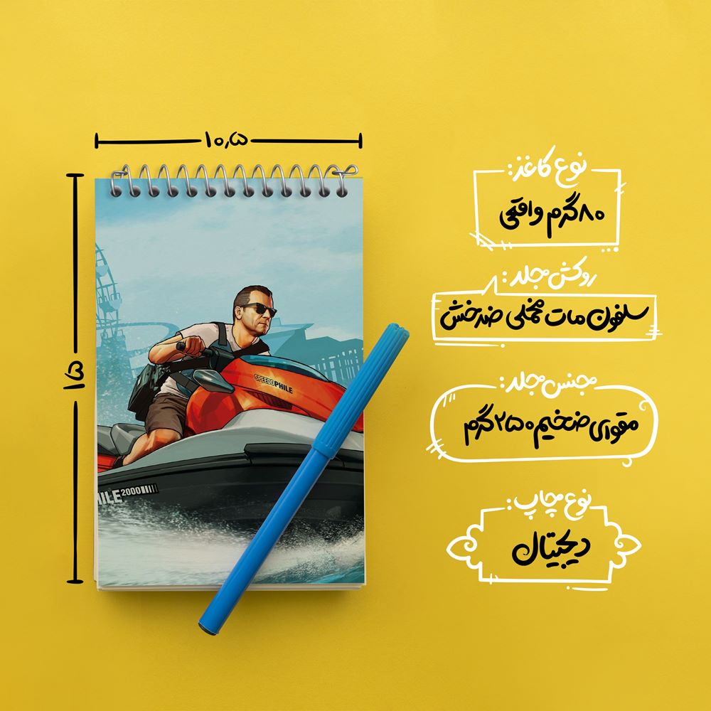 برند خندالو در زمینه تولید انواع دفاتر فانتزی و تحصیلی فعالیت میکند که به دلیل جذابیت ظاهری و طرح های متنوع طرفداران زیادی دارد. دفتر یادداشت خندالو طرح مایکل جی تی ای GTA محصولی مناسب برای همه عاشقان لوازم التحریر است و همچنین همه کسانی که بنا به موقعیت تحصیل یا شغلشان با دفتر و نوشت افزار زیاد سر و کار دارند. در تولید دفتر یادداشت خندالو طرح مایکل جی تی ای GTA از نوع صحافی فنر مارپیچ استفاده شده که در این نوع صحافی برگهها به راحتی چرخیده و یا بیرون آورده می شوند. دفتر های خندالو دارای جلد انعطاف پذیر از جنس مقوای گلاسه 250 گرم با روکش سلفون مات مخملی است که به شما امکان میدهد از دفتر خود بدون اینکه نگرانی از شکستن یا خراب شدن جلد را داشته باشید استفاده کنید و همچنین در این دفاتر از کاغذ 80 گرم با کیفیت استفاده شده که باعث میشود هنگام نوشتن به خوبی جوهر قلم بر روی صفحه نشسته و از خط خوردگیها جلوگیری کند. دفتر یادداشت خندالو با جنس و دوام مناسب، برگه های کاملاً سفید و خطوط طوسی دقیق را داراست که انسان را به نوشتن منظم و زیبا ترغیب میکند. طراحی کاملاً مناسب این دفاتر، به همراه کیفیت بالا، از آن یک محصول مورد علاقه و قابل اعتماد برای همه مقاطع تحصیلی میسازد. دفتر یادداشت خندالو طرح مایکل جی تی ای GTA انتخابی هوشمندانه و مناسب برای افرادی است که به دنبال دفتری با کیفیت و کاربرد عالی هستند. این دفتر، همراه خوبی برای شما در تمام مراحل تحصیل و کار خواهد بود و تجربهای لذتبخش از نوشتن و آموختن را به شما هدیه میدهد.