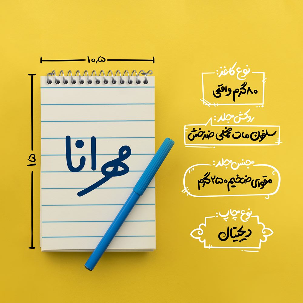 برند خندالو در زمینه تولید انواع دفاتر فانتزی و تحصیلی فعالیت میکند که به دلیل جذابیت ظاهری و طرح های متنوع طرفداران زیادی دارد. دفتر یادداشت خندالو طرح مهرانا محصولی مناسب برای همه عاشقان لوازم التحریر است و همچنین همه کسانی که بنا به موقعیت تحصیل یا شغلشان با دفتر و نوشت افزار زیاد سر و کار دارند. در تولید دفتر یادداشت خندالو طرح مهرانا از نوع صحافی فنر مارپیچ استفاده شده که در این نوع صحافی برگه‌ها به راحتی چرخیده و یا بیرون آورده می شوند.