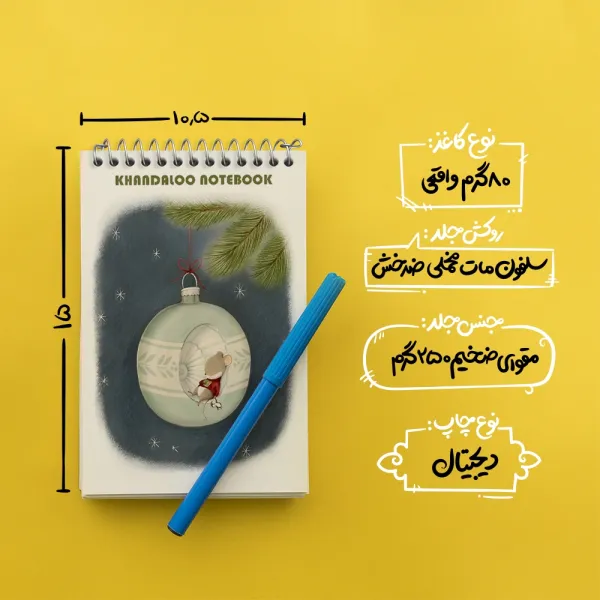 برند خندالو در زمینه تولید انواع دفاتر فانتزی و تحصیلی فعالیت میکند که به دلیل جذابیت ظاهری و طرح های متنوع طرفداران زیادی دارد. دفتر یادداشت خندالو طرح موش و کریسمس محصولی مناسب برای همه عاشقان لوازم التحریر است و همچنین همه کسانی که بنا به موقعیت تحصیل یا شغلشان با دفتر و نوشت افزار زیاد سر و کار دارند. در تولید دفتر یادداشت خندالو طرح موش و کریسمس از نوع صحافی فنر مارپیچ استفاده شده که در این نوع صحافی برگه‌ها به راحتی چرخیده و یا بیرون آورده می شوند.