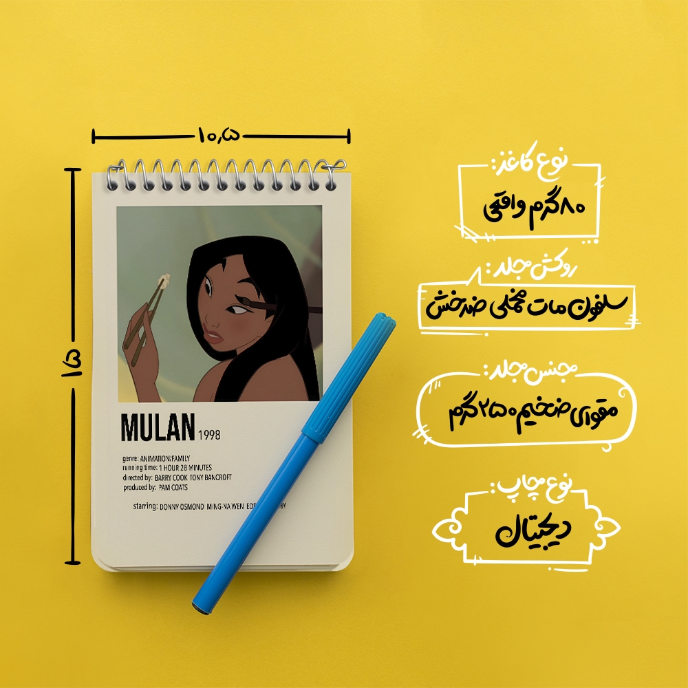 برند خندالو در زمینه تولید انواع دفاتر فانتزی و تحصیلی فعالیت میکند که به دلیل جذابیت ظاهری و طرح های متنوع طرفداران زیادی دارد. دفتر یادداشت خندالو طرح مولان (Mulan) محصولی مناسب برای همه عاشقان لوازم التحریر است و همچنین همه کسانی که بنا به موقعیت تحصیل یا شغلشان با دفتر و نوشت افزار زیاد سر و کار دارند. در تولید دفتر یادداشت خندالو طرح مولان (Mulan) از نوع صحافی فنر مارپیچ استفاده شده که در این نوع صحافی برگهها به راحتی چرخیده و یا بیرون آورده می شوند. دفتر های خندالو دارای جلد انعطاف پذیر از جنس مقوای گلاسه 250 گرم با روکش سلفون مات مخملی است که به شما امکان میدهد از دفتر خود بدون اینکه نگرانی از شکستن یا خراب شدن جلد را داشته باشید استفاده کنید و همچنین در این دفاتر از کاغذ 80 گرم با کیفیت استفاده شده که باعث میشود هنگام نوشتن به خوبی جوهر قلم بر روی صفحه نشسته و از خط خوردگیها جلوگیری کند. دفتر یادداشت خندالو با جنس و دوام مناسب، برگه های کاملاً سفید و خطوط طوسی دقیق را داراست که انسان را به نوشتن منظم و زیبا ترغیب میکند. طراحی کاملاً مناسب این دفاتر، به همراه کیفیت بالا، از آن یک محصول مورد علاقه و قابل اعتماد برای همه مقاطع تحصیلی میسازد. دفتر یادداشت خندالو طرح مولان (Mulan) انتخابی هوشمندانه و مناسب برای افرادی است که به دنبال دفتری با کیفیت و کاربرد عالی هستند. این دفتر، همراه خوبی برای شما در تمام مراحل تحصیل و کار خواهد بود و تجربهای لذتبخش از نوشتن و آموختن را به شما هدیه میدهد.