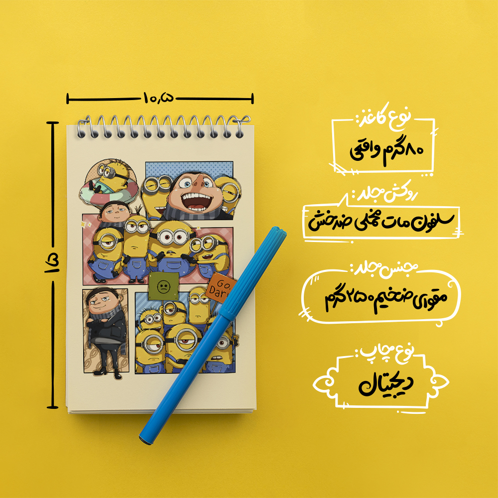 برند خندالو در زمینه تولید انواع دفاتر فانتزی و تحصیلی فعالیت میکند که به دلیل جذابیت ظاهری و طرح های متنوع طرفداران زیادی دارد. دفتر یادداشت خندالو طرح مینیون ها (Minions) محصولی مناسب برای همه عاشقان لوازم التحریر است و همچنین همه کسانی که بنا به موقعیت تحصیل یا شغلشان با دفتر و نوشت افزار زیاد سر و کار دارند. در تولید دفتر یادداشت خندالو طرح مینیون ها (Minions) از نوع صحافی فنر مارپیچ استفاده شده که در این نوع صحافی برگه‌ها به راحتی چرخیده و یا بیرون آورده می شوند.
