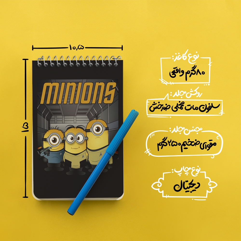 برند خندالو در زمینه تولید انواع دفاتر فانتزی و تحصیلی فعالیت میکند که به دلیل جذابیت ظاهری و طرح های متنوع طرفداران زیادی دارد. دفتر یادداشت خندالو طرح مینیون ها (Minions) محصولی مناسب برای همه عاشقان لوازم التحریر است و همچنین همه کسانی که بنا به موقعیت تحصیل یا شغلشان با دفتر و نوشت افزار زیاد سر و کار دارند. در تولید دفتر یادداشت خندالو طرح مینیون ها (Minions) از نوع صحافی فنر مارپیچ استفاده شده که در این نوع صحافی برگه‌ها به راحتی چرخیده و یا بیرون آورده می شوند.