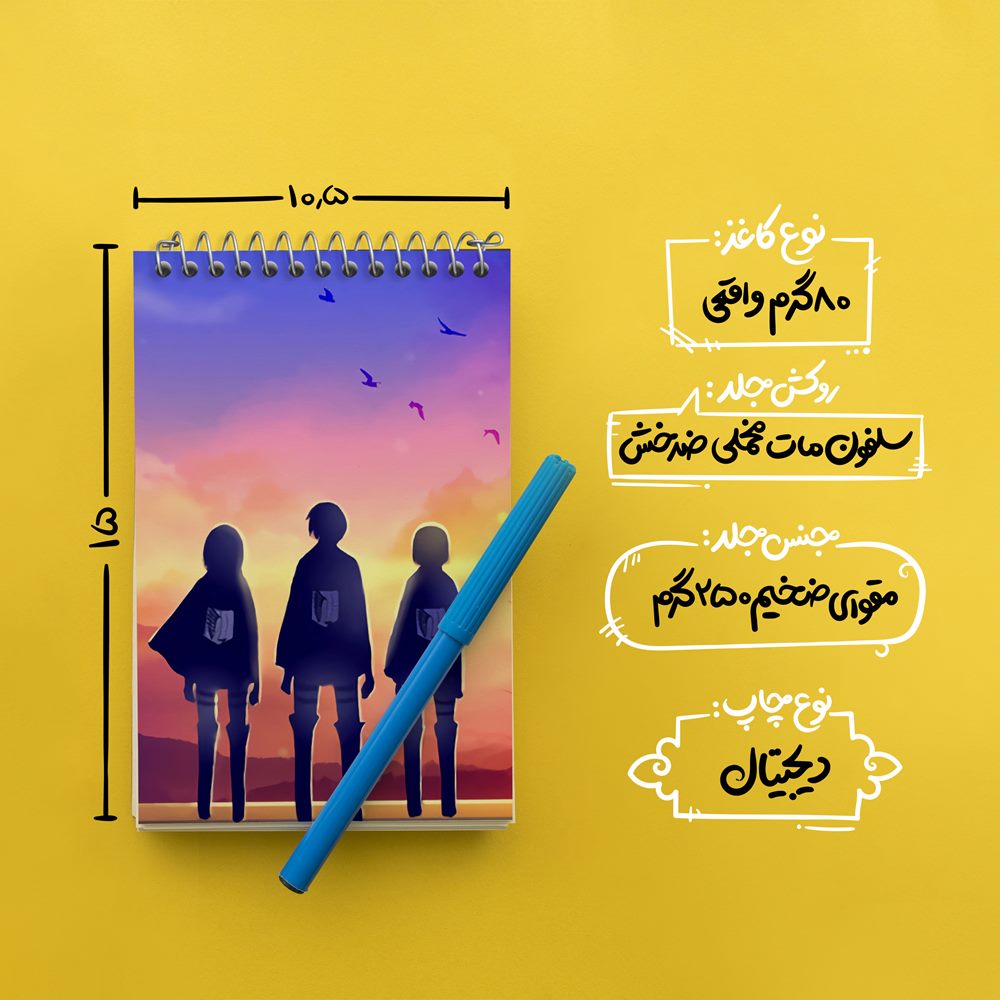 برند خندالو در زمینه تولید انواع دفاتر فانتزی و تحصیلی فعالیت میکند که به دلیل جذابیت ظاهری و طرح های متنوع طرفداران زیادی دارد. دفتر یادداشت خندالو طرح میکاسا و ارن و آرمین انیمه اتک آن تایتان Attack on Titan محصولی مناسب برای همه عاشقان لوازم التحریر است و همچنین همه کسانی که بنا به موقعیت تحصیل یا شغلشان با دفتر و نوشت افزار زیاد سر و کار دارند. در تولید دفتر یادداشت خندالو طرح میکاسا و ارن و آرمین انیمه اتک آن تایتان Attack on Titan از نوع صحافی فنر مارپیچ استفاده شده که در این نوع صحافی برگهها به راحتی چرخیده و یا بیرون آورده می شوند. دفتر های خندالو دارای جلد انعطاف پذیر از جنس مقوای گلاسه 250 گرم با روکش سلفون مات مخملی است که به شما امکان میدهد از دفتر خود بدون اینکه نگرانی از شکستن یا خراب شدن جلد را داشته باشید استفاده کنید و همچنین در این دفاتر از کاغذ 80 گرم با کیفیت استفاده شده که باعث میشود هنگام نوشتن به خوبی جوهر قلم بر روی صفحه نشسته و از خط خوردگیها جلوگیری کند. دفتر یادداشت خندالو با جنس و دوام مناسب، برگه های کاملاً سفید و خطوط طوسی دقیق را داراست که انسان را به نوشتن منظم و زیبا ترغیب میکند. طراحی کاملاً مناسب این دفاتر، به همراه کیفیت بالا، از آن یک محصول مورد علاقه و قابل اعتماد برای همه مقاطع تحصیلی میسازد. دفتر یادداشت خندالو طرح میکاسا و ارن و آرمین انیمه اتک آن تایتان Attack on Titan انتخابی هوشمندانه و مناسب برای افرادی است که به دنبال دفتری با کیفیت و کاربرد عالی هستند. این دفتر، همراه خوبی برای شما در تمام مراحل تحصیل و کار خواهد بود و تجربهای لذتبخش از نوشتن و آموختن را به شما هدیه میدهد.