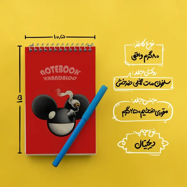 برند خندالو در زمینه تولید انواع دفاتر فانتزی و تحصیلی فعالیت میکند که به دلیل جذابیت ظاهری و طرح های متنوع طرفداران زیادی دارد. دفتر یادداشت خندالو طرح میکی موس (Mickey mouse) محصولی مناسب برای همه عاشقان لوازم التحریر است و همچنین همه کسانی که بنا به موقعیت تحصیل یا شغلشان با دفتر و نوشت افزار زیاد سر و کار دارند. در تولید دفتر یادداشت خندالو طرح میکی موس (Mickey mouse) از نوع صحافی فنر مارپیچ استفاده شده که در این نوع صحافی برگه‌ها به راحتی چرخیده و یا بیرون آورده می شوند.
