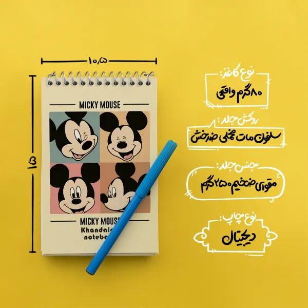 برند خندالو در زمینه تولید انواع دفاتر فانتزی و تحصیلی فعالیت میکند که به دلیل جذابیت ظاهری و طرح های متنوع طرفداران زیادی دارد. دفتر یادداشت خندالو طرح میکی موس (Mickey mouse) محصولی مناسب برای همه عاشقان لوازم التحریر است و همچنین همه کسانی که بنا به موقعیت تحصیل یا شغلشان با دفتر و نوشت افزار زیاد سر و کار دارند. در تولید دفتر یادداشت خندالو طرح میکی موس (Mickey mouse) از نوع صحافی فنر مارپیچ استفاده شده که در این نوع صحافی برگهها به راحتی چرخیده و یا بیرون آورده می شوند. دفتر های خندالو دارای جلد انعطاف پذیر از جنس مقوای گلاسه 250 گرم با روکش سلفون مات مخملی است که به شما امکان میدهد از دفتر خود بدون اینکه نگرانی از شکستن یا خراب شدن جلد را داشته باشید استفاده کنید و همچنین در این دفاتر از کاغذ 80 گرم با کیفیت استفاده شده که باعث میشود هنگام نوشتن به خوبی جوهر قلم بر روی صفحه نشسته و از خط خوردگیها جلوگیری کند. دفتر یادداشت خندالو با جنس و دوام مناسب، برگه های کاملاً سفید و خطوط طوسی دقیق را داراست که انسان را به نوشتن منظم و زیبا ترغیب میکند. طراحی کاملاً مناسب این دفاتر، به همراه کیفیت بالا، از آن یک محصول مورد علاقه و قابل اعتماد برای همه مقاطع تحصیلی میسازد. دفتر یادداشت خندالو طرح میکی موس (Mickey mouse) انتخابی هوشمندانه و مناسب برای افرادی است که به دنبال دفتری با کیفیت و کاربرد عالی هستند. این دفتر، همراه خوبی برای شما در تمام مراحل تحصیل و کار خواهد بود و تجربهای لذتبخش از نوشتن و آموختن را به شما هدیه میدهد.