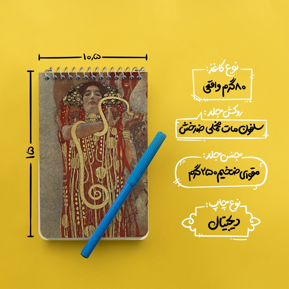 برند خندالو در زمینه تولید انواع دفاتر فانتزی و تحصیلی فعالیت میکند که به دلیل جذابیت ظاهری و طرح های متنوع طرفداران زیادی دارد. دفتر یادداشت خندالو طرح نقاشی بهداشت اثر گوستاو کلیمت محصولی مناسب برای همه عاشقان لوازم التحریر است و همچنین همه کسانی که بنا به موقعیت تحصیل یا شغلشان با دفتر و نوشت افزار زیاد سر و کار دارند. در تولید دفتر یادداشت خندالو طرح نقاشی بهداشت اثر گوستاو کلیمت از نوع صحافی فنر مارپیچ استفاده شده که در این نوع صحافی برگهها به راحتی چرخیده و یا بیرون آورده می شوند. دفتر های خندالو دارای جلد انعطاف پذیر از جنس مقوای گلاسه 250 گرم با روکش سلفون مات مخملی است که به شما امکان میدهد از دفتر خود بدون اینکه نگرانی از شکستن یا خراب شدن جلد را داشته باشید استفاده کنید و همچنین در این دفاتر از کاغذ 80 گرم با کیفیت استفاده شده که باعث میشود هنگام نوشتن به خوبی جوهر قلم بر روی صفحه نشسته و از خط خوردگیها جلوگیری کند. دفتر یادداشت خندالو با جنس و دوام مناسب، برگه های کاملاً سفید و خطوط طوسی دقیق را داراست که انسان را به نوشتن منظم و زیبا ترغیب میکند. طراحی کاملاً مناسب این دفاتر، به همراه کیفیت بالا، از آن یک محصول مورد علاقه و قابل اعتماد برای همه مقاطع تحصیلی میسازد. دفتر یادداشت خندالو طرح نقاشی بهداشت اثر گوستاو کلیمت انتخابی هوشمندانه و مناسب برای افرادی است که به دنبال دفتری با کیفیت و کاربرد عالی هستند. این دفتر، همراه خوبی برای شما در تمام مراحل تحصیل و کار خواهد بود و تجربهای لذتبخش از نوشتن و آموختن را به شما هدیه میدهد.
