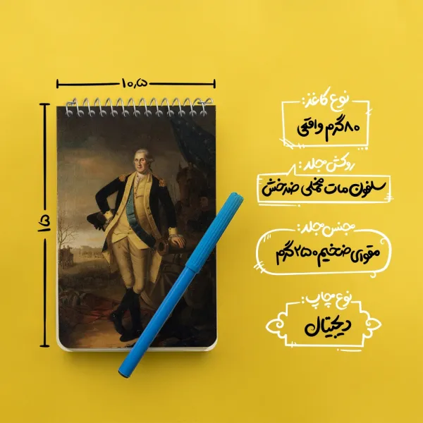 برند خندالو در زمینه تولید انواع دفاتر فانتزی و تحصیلی فعالیت میکند که به دلیل جذابیت ظاهری و طرح های متنوع طرفداران زیادی دارد. دفتر یادداشت خندالو طرح نقاشی جورج واشنگتن اثر چارلز ویلسون پیل محصولی مناسب برای همه عاشقان لوازم التحریر است و همچنین همه کسانی که بنا به موقعیت تحصیل یا شغلشان با دفتر و نوشت افزار زیاد سر و کار دارند. در تولید دفتر یادداشت خندالو طرح نقاشی جورج واشنگتن اثر چارلز ویلسون پیل از نوع صحافی فنر مارپیچ استفاده شده که در این نوع صحافی برگهها به راحتی چرخیده و یا بیرون آورده می شوند. دفتر های خندالو دارای جلد انعطاف پذیر از جنس مقوای گلاسه 250 گرم با روکش سلفون مات مخملی است که به شما امکان میدهد از دفتر خود بدون اینکه نگرانی از شکستن یا خراب شدن جلد را داشته باشید استفاده کنید و همچنین در این دفاتر از کاغذ 80 گرم با کیفیت استفاده شده که باعث میشود هنگام نوشتن به خوبی جوهر قلم بر روی صفحه نشسته و از خط خوردگیها جلوگیری کند. دفتر یادداشت خندالو با جنس و دوام مناسب، برگه های کاملاً سفید و خطوط طوسی دقیق را داراست که انسان را به نوشتن منظم و زیبا ترغیب میکند. طراحی کاملاً مناسب این دفاتر، به همراه کیفیت بالا، از آن یک محصول مورد علاقه و قابل اعتماد برای همه مقاطع تحصیلی میسازد. دفتر یادداشت خندالو طرح نقاشی جورج واشنگتن اثر چارلز ویلسون پیل انتخابی هوشمندانه و مناسب برای افرادی است که به دنبال دفتری با کیفیت و کاربرد عالی هستند. این دفتر، همراه خوبی برای شما در تمام مراحل تحصیل و کار خواهد بود و تجربهای لذتبخش از نوشتن و آموختن را به شما هدیه میدهد.