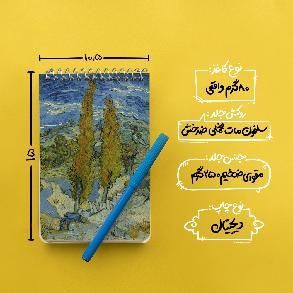 برند خندالو در زمینه تولید انواع دفاتر فانتزی و تحصیلی فعالیت میکند که به دلیل جذابیت ظاهری و طرح های متنوع طرفداران زیادی دارد. دفتر یادداشت خندالو طرح نقاشی دو صنوبر در آلپیل نزدیک سن رمی اثر ونسان ونگوگ محصولی مناسب برای همه عاشقان لوازم التحریر است و همچنین همه کسانی که بنا به موقعیت تحصیل یا شغلشان با دفتر و نوشت افزار زیاد سر و کار دارند. در تولید دفتر یادداشت خندالو طرح نقاشی دو صنوبر در آلپیل نزدیک سن رمی اثر ونسان ونگوگ از نوع صحافی فنر مارپیچ استفاده شده که در این نوع صحافی برگهها به راحتی چرخیده و یا بیرون آورده می شوند. دفتر های خندالو دارای جلد انعطاف پذیر از جنس مقوای گلاسه 250 گرم با روکش سلفون مات مخملی است که به شما امکان میدهد از دفتر خود بدون اینکه نگرانی از شکستن یا خراب شدن جلد را داشته باشید استفاده کنید و همچنین در این دفاتر از کاغذ 80 گرم با کیفیت استفاده شده که باعث میشود هنگام نوشتن به خوبی جوهر قلم بر روی صفحه نشسته و از خط خوردگیها جلوگیری کند. دفتر یادداشت خندالو با جنس و دوام مناسب، برگه های کاملاً سفید و خطوط طوسی دقیق را داراست که انسان را به نوشتن منظم و زیبا ترغیب میکند. طراحی کاملاً مناسب این دفاتر، به همراه کیفیت بالا، از آن یک محصول مورد علاقه و قابل اعتماد برای همه مقاطع تحصیلی میسازد. دفتر یادداشت خندالو طرح نقاشی دو صنوبر در آلپیل نزدیک سن رمی اثر ونسان ونگوگ انتخابی هوشمندانه و مناسب برای افرادی است که به دنبال دفتری با کیفیت و کاربرد عالی هستند. این دفتر، همراه خوبی برای شما در تمام مراحل تحصیل و کار خواهد بود و تجربهای لذتبخش از نوشتن و آموختن را به شما هدیه میدهد.