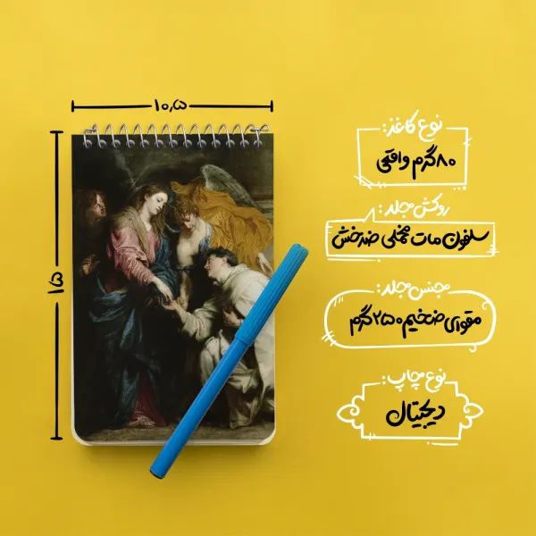 برند خندالو در زمینه تولید انواع دفاتر فانتزی و تحصیلی فعالیت میکند که به دلیل جذابیت ظاهری و طرح های متنوع طرفداران زیادی دارد. دفتر یادداشت خندالو طرح نقاشی رویای هرمان جوزف اثر آنتونی ون دایک محصولی مناسب برای همه عاشقان لوازم التحریر است و همچنین همه کسانی که بنا به موقعیت تحصیل یا شغلشان با دفتر و نوشت افزار زیاد سر و کار دارند. در تولید دفتر یادداشت خندالو طرح نقاشی رویای هرمان جوزف اثر آنتونی ون دایک از نوع صحافی فنر مارپیچ استفاده شده که در این نوع صحافی برگهها به راحتی چرخیده و یا بیرون آورده می شوند. دفتر های خندالو دارای جلد انعطاف پذیر از جنس مقوای گلاسه 250 گرم با روکش سلفون مات مخملی است که به شما امکان میدهد از دفتر خود بدون اینکه نگرانی از شکستن یا خراب شدن جلد را داشته باشید استفاده کنید و همچنین در این دفاتر از کاغذ 80 گرم با کیفیت استفاده شده که باعث میشود هنگام نوشتن به خوبی جوهر قلم بر روی صفحه نشسته و از خط خوردگیها جلوگیری کند. دفتر یادداشت خندالو با جنس و دوام مناسب، برگه های کاملاً سفید و خطوط طوسی دقیق را داراست که انسان را به نوشتن منظم و زیبا ترغیب میکند. طراحی کاملاً مناسب این دفاتر، به همراه کیفیت بالا، از آن یک محصول مورد علاقه و قابل اعتماد برای همه مقاطع تحصیلی میسازد. دفتر یادداشت خندالو طرح نقاشی رویای هرمان جوزف اثر آنتونی ون دایک انتخابی هوشمندانه و مناسب برای افرادی است که به دنبال دفتری با کیفیت و کاربرد عالی هستند. این دفتر، همراه خوبی برای شما در تمام مراحل تحصیل و کار خواهد بود و تجربهای لذتبخش از نوشتن و آموختن را به شما هدیه میدهد.
