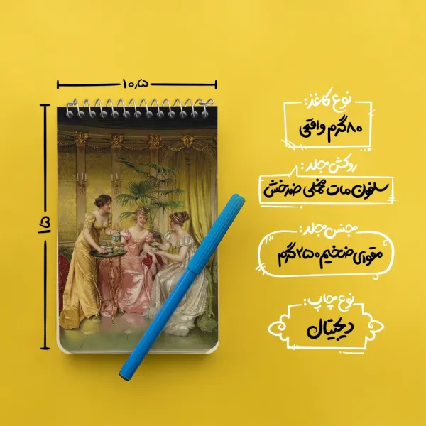 برند خندالو در زمینه تولید انواع دفاتر فانتزی و تحصیلی فعالیت میکند که به دلیل جذابیت ظاهری و طرح های متنوع طرفداران زیادی دارد. دفتر یادداشت خندالو طرح نقاشی زمان چای اثر فردریک سولاکروا محصولی مناسب برای همه عاشقان لوازم التحریر است و همچنین همه کسانی که بنا به موقعیت تحصیل یا شغلشان با دفتر و نوشت افزار زیاد سر و کار دارند. در تولید دفتر یادداشت خندالو طرح نقاشی زمان چای اثر فردریک سولاکروا از نوع صحافی فنر مارپیچ استفاده شده که در این نوع صحافی برگهها به راحتی چرخیده و یا بیرون آورده می شوند. دفتر های خندالو دارای جلد انعطاف پذیر از جنس مقوای گلاسه 250 گرم با روکش سلفون مات مخملی است که به شما امکان میدهد از دفتر خود بدون اینکه نگرانی از شکستن یا خراب شدن جلد را داشته باشید استفاده کنید و همچنین در این دفاتر از کاغذ 80 گرم با کیفیت استفاده شده که باعث میشود هنگام نوشتن به خوبی جوهر قلم بر روی صفحه نشسته و از خط خوردگیها جلوگیری کند. دفتر یادداشت خندالو با جنس و دوام مناسب، برگه های کاملاً سفید و خطوط طوسی دقیق را داراست که انسان را به نوشتن منظم و زیبا ترغیب میکند. طراحی کاملاً مناسب این دفاتر، به همراه کیفیت بالا، از آن یک محصول مورد علاقه و قابل اعتماد برای همه مقاطع تحصیلی میسازد. دفتر یادداشت خندالو طرح نقاشی زمان چای اثر فردریک سولاکروا انتخابی هوشمندانه و مناسب برای افرادی است که به دنبال دفتری با کیفیت و کاربرد عالی هستند. این دفتر، همراه خوبی برای شما در تمام مراحل تحصیل و کار خواهد بود و تجربهای لذتبخش از نوشتن و آموختن را به شما هدیه میدهد.