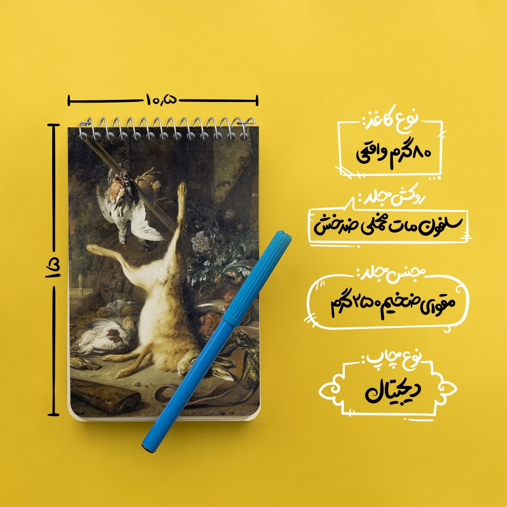 برند خندالو در زمینه تولید انواع دفاتر فانتزی و تحصیلی فعالیت میکند که به دلیل جذابیت ظاهری و طرح های متنوع طرفداران زیادی دارد. دفتر یادداشت خندالو طرح نقاشی زندگی بی جان با خرگوش مرده و پرندگان اثر جان وینیکس محصولی مناسب برای همه عاشقان لوازم التحریر است و همچنین همه کسانی که بنا به موقعیت تحصیل یا شغلشان با دفتر و نوشت افزار زیاد سر و کار دارند. در تولید دفتر یادداشت خندالو طرح نقاشی زندگی بی جان با خرگوش مرده و پرندگان اثر جان وینیکس از نوع صحافی فنر مارپیچ استفاده شده که در این نوع صحافی برگهها به راحتی چرخیده و یا بیرون آورده می شوند. دفتر های خندالو دارای جلد انعطاف پذیر از جنس مقوای گلاسه 250 گرم با روکش سلفون مات مخملی است که به شما امکان میدهد از دفتر خود بدون اینکه نگرانی از شکستن یا خراب شدن جلد را داشته باشید استفاده کنید و همچنین در این دفاتر از کاغذ 80 گرم با کیفیت استفاده شده که باعث میشود هنگام نوشتن به خوبی جوهر قلم بر روی صفحه نشسته و از خط خوردگیها جلوگیری کند. دفتر یادداشت خندالو با جنس و دوام مناسب، برگه های کاملاً سفید و خطوط طوسی دقیق را داراست که انسان را به نوشتن منظم و زیبا ترغیب میکند. طراحی کاملاً مناسب این دفاتر، به همراه کیفیت بالا، از آن یک محصول مورد علاقه و قابل اعتماد برای همه مقاطع تحصیلی میسازد. دفتر یادداشت خندالو طرح نقاشی زندگی بی جان با خرگوش مرده و پرندگان اثر جان وینیکس انتخابی هوشمندانه و مناسب برای افرادی است که به دنبال دفتری با کیفیت و کاربرد عالی هستند. این دفتر، همراه خوبی برای شما در تمام مراحل تحصیل و کار خواهد بود و تجربهای لذتبخش از نوشتن و آموختن را به شما هدیه میدهد.