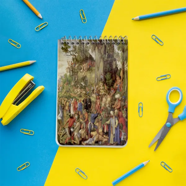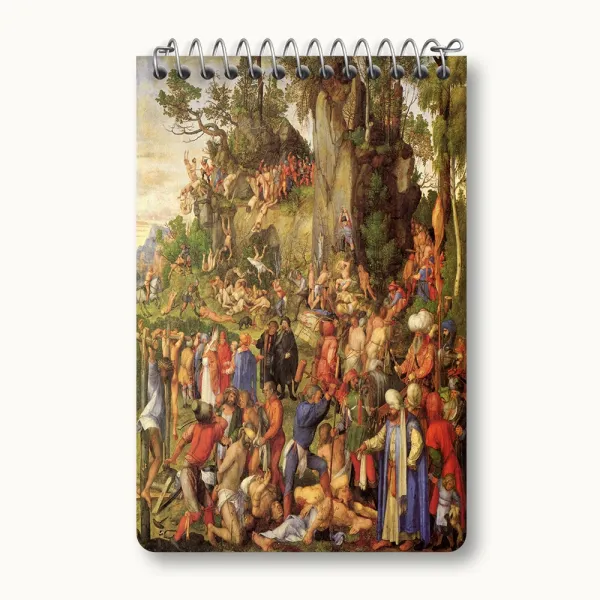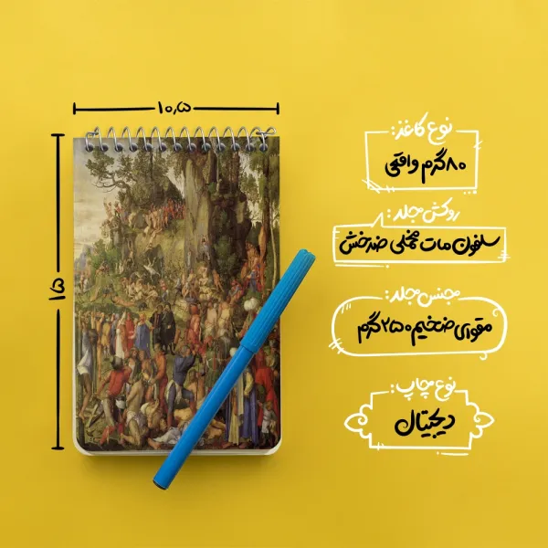 برند خندالو در زمینه تولید انواع دفاتر فانتزی و تحصیلی فعالیت میکند که به دلیل جذابیت ظاهری و طرح های متنوع طرفداران زیادی دارد. دفتر یادداشت خندالو طرح نقاشی شهادت ده هزار نفر اثر آلبرشت دورر محصولی مناسب برای همه عاشقان لوازم التحریر است و همچنین همه کسانی که بنا به موقعیت تحصیل یا شغلشان با دفتر و نوشت افزار زیاد سر و کار دارند. در تولید دفتر یادداشت خندالو طرح نقاشی شهادت ده هزار نفر اثر آلبرشت دورر از نوع صحافی فنر مارپیچ استفاده شده که در این نوع صحافی برگهها به راحتی چرخیده و یا بیرون آورده می شوند. دفتر های خندالو دارای جلد انعطاف پذیر از جنس مقوای گلاسه 250 گرم با روکش سلفون مات مخملی است که به شما امکان میدهد از دفتر خود بدون اینکه نگرانی از شکستن یا خراب شدن جلد را داشته باشید استفاده کنید و همچنین در این دفاتر از کاغذ 80 گرم با کیفیت استفاده شده که باعث میشود هنگام نوشتن به خوبی جوهر قلم بر روی صفحه نشسته و از خط خوردگیها جلوگیری کند. دفتر یادداشت خندالو با جنس و دوام مناسب، برگه های کاملاً سفید و خطوط طوسی دقیق را داراست که انسان را به نوشتن منظم و زیبا ترغیب میکند. طراحی کاملاً مناسب این دفاتر، به همراه کیفیت بالا، از آن یک محصول مورد علاقه و قابل اعتماد برای همه مقاطع تحصیلی میسازد. دفتر یادداشت خندالو طرح نقاشی شهادت ده هزار نفر اثر آلبرشت دورر انتخابی هوشمندانه و مناسب برای افرادی است که به دنبال دفتری با کیفیت و کاربرد عالی هستند. این دفتر، همراه خوبی برای شما در تمام مراحل تحصیل و کار خواهد بود و تجربهای لذتبخش از نوشتن و آموختن را به شما هدیه میدهد.