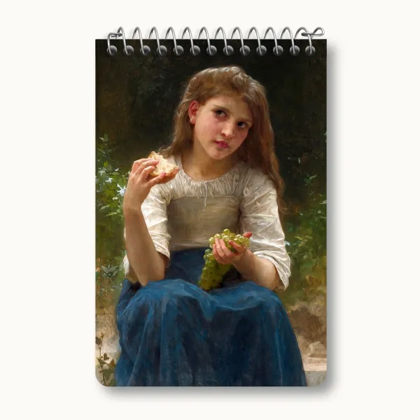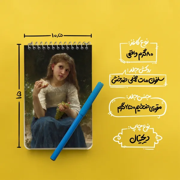 برند خندالو در زمینه تولید انواع دفاتر فانتزی و تحصیلی فعالیت میکند که به دلیل جذابیت ظاهری و طرح های متنوع طرفداران زیادی دارد. دفتر یادداشت خندالو طرح نقاشی میان وعده اثر ویلیام بوگرو محصولی مناسب برای همه عاشقان لوازم التحریر است و همچنین همه کسانی که بنا به موقعیت تحصیل یا شغلشان با دفتر و نوشت افزار زیاد سر و کار دارند. در تولید دفتر یادداشت خندالو طرح نقاشی میان وعده اثر ویلیام بوگرو از نوع صحافی فنر مارپیچ استفاده شده که در این نوع صحافی برگهها به راحتی چرخیده و یا بیرون آورده می شوند. دفتر های خندالو دارای جلد انعطاف پذیر از جنس مقوای گلاسه 250 گرم با روکش سلفون مات مخملی است که به شما امکان میدهد از دفتر خود بدون اینکه نگرانی از شکستن یا خراب شدن جلد را داشته باشید استفاده کنید و همچنین در این دفاتر از کاغذ 80 گرم با کیفیت استفاده شده که باعث میشود هنگام نوشتن به خوبی جوهر قلم بر روی صفحه نشسته و از خط خوردگیها جلوگیری کند. دفتر یادداشت خندالو با جنس و دوام مناسب، برگه های کاملاً سفید و خطوط طوسی دقیق را داراست که انسان را به نوشتن منظم و زیبا ترغیب میکند. طراحی کاملاً مناسب این دفاتر، به همراه کیفیت بالا، از آن یک محصول مورد علاقه و قابل اعتماد برای همه مقاطع تحصیلی میسازد. دفتر یادداشت خندالو طرح نقاشی میان وعده اثر ویلیام بوگرو انتخابی هوشمندانه و مناسب برای افرادی است که به دنبال دفتری با کیفیت و کاربرد عالی هستند. این دفتر، همراه خوبی برای شما در تمام مراحل تحصیل و کار خواهد بود و تجربهای لذتبخش از نوشتن و آموختن را به شما هدیه میدهد.