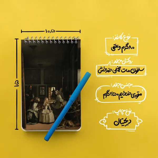 برند خندالو در زمینه تولید انواع دفاتر فانتزی و تحصیلی فعالیت میکند که به دلیل جذابیت ظاهری و طرح های متنوع طرفداران زیادی دارد. دفتر یادداشت خندالو طرح نقاشی ندیمه ها اثر دیهگو ولاسکس محصولی مناسب برای همه عاشقان لوازم التحریر است و همچنین همه کسانی که بنا به موقعیت تحصیل یا شغلشان با دفتر و نوشت افزار زیاد سر و کار دارند. در تولید دفتر یادداشت خندالو طرح نقاشی ندیمه ها اثر دیهگو ولاسکس از نوع صحافی فنر مارپیچ استفاده شده که در این نوع صحافی برگهها به راحتی چرخیده و یا بیرون آورده می شوند. دفتر های خندالو دارای جلد انعطاف پذیر از جنس مقوای گلاسه 250 گرم با روکش سلفون مات مخملی است که به شما امکان میدهد از دفتر خود بدون اینکه نگرانی از شکستن یا خراب شدن جلد را داشته باشید استفاده کنید و همچنین در این دفاتر از کاغذ 80 گرم با کیفیت استفاده شده که باعث میشود هنگام نوشتن به خوبی جوهر قلم بر روی صفحه نشسته و از خط خوردگیها جلوگیری کند. دفتر یادداشت خندالو با جنس و دوام مناسب، برگه های کاملاً سفید و خطوط طوسی دقیق را داراست که انسان را به نوشتن منظم و زیبا ترغیب میکند. طراحی کاملاً مناسب این دفاتر، به همراه کیفیت بالا، از آن یک محصول مورد علاقه و قابل اعتماد برای همه مقاطع تحصیلی میسازد. دفتر یادداشت خندالو طرح نقاشی ندیمه ها اثر دیهگو ولاسکس انتخابی هوشمندانه و مناسب برای افرادی است که به دنبال دفتری با کیفیت و کاربرد عالی هستند. این دفتر، همراه خوبی برای شما در تمام مراحل تحصیل و کار خواهد بود و تجربهای لذتبخش از نوشتن و آموختن را به شما هدیه میدهد.
