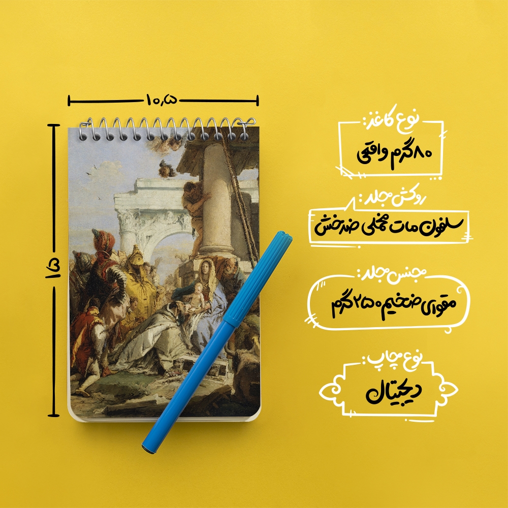 برند خندالو در زمینه تولید انواع دفاتر فانتزی و تحصیلی فعالیت میکند که به دلیل جذابیت ظاهری و طرح های متنوع طرفداران زیادی دارد. دفتر یادداشت خندالو طرح نقاشی پرستش مجوس اثر جیووانی باتیستا تیپولو محصولی مناسب برای همه عاشقان لوازم التحریر است و همچنین همه کسانی که بنا به موقعیت تحصیل یا شغلشان با دفتر و نوشت افزار زیاد سر و کار دارند. در تولید دفتر یادداشت خندالو طرح نقاشی پرستش مجوس اثر جیووانی باتیستا تیپولو از نوع صحافی فنر مارپیچ استفاده شده که در این نوع صحافی برگهها به راحتی چرخیده و یا بیرون آورده می شوند. دفتر های خندالو دارای جلد انعطاف پذیر از جنس مقوای گلاسه 250 گرم با روکش سلفون مات مخملی است که به شما امکان میدهد از دفتر خود بدون اینکه نگرانی از شکستن یا خراب شدن جلد را داشته باشید استفاده کنید و همچنین در این دفاتر از کاغذ 80 گرم با کیفیت استفاده شده که باعث میشود هنگام نوشتن به خوبی جوهر قلم بر روی صفحه نشسته و از خط خوردگیها جلوگیری کند. دفتر یادداشت خندالو با جنس و دوام مناسب، برگه های کاملاً سفید و خطوط طوسی دقیق را داراست که انسان را به نوشتن منظم و زیبا ترغیب میکند. طراحی کاملاً مناسب این دفاتر، به همراه کیفیت بالا، از آن یک محصول مورد علاقه و قابل اعتماد برای همه مقاطع تحصیلی میسازد. دفتر یادداشت خندالو طرح نقاشی پرستش مجوس اثر جیووانی باتیستا تیپولو انتخابی هوشمندانه و مناسب برای افرادی است که به دنبال دفتری با کیفیت و کاربرد عالی هستند. این دفتر، همراه خوبی برای شما در تمام مراحل تحصیل و کار خواهد بود و تجربهای لذتبخش از نوشتن و آموختن را به شما هدیه میدهد.