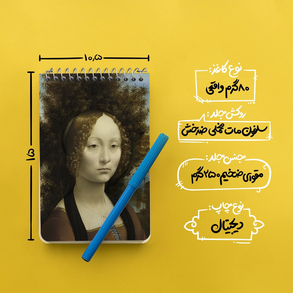 برند خندالو در زمینه تولید انواع دفاتر فانتزی و تحصیلی فعالیت میکند که به دلیل جذابیت ظاهری و طرح های متنوع طرفداران زیادی دارد. دفتر یادداشت خندالو طرح نقاشی ژینورا دی بنچی اثر لئوناردو داوینچی محصولی مناسب برای همه عاشقان لوازم التحریر است و همچنین همه کسانی که بنا به موقعیت تحصیل یا شغلشان با دفتر و نوشت افزار زیاد سر و کار دارند. در تولید دفتر یادداشت خندالو طرح نقاشی ژینورا دی بنچی اثر لئوناردو داوینچی از نوع صحافی فنر مارپیچ استفاده شده که در این نوع صحافی برگهها به راحتی چرخیده و یا بیرون آورده می شوند. دفتر های خندالو دارای جلد انعطاف پذیر از جنس مقوای گلاسه 250 گرم با روکش سلفون مات مخملی است که به شما امکان میدهد از دفتر خود بدون اینکه نگرانی از شکستن یا خراب شدن جلد را داشته باشید استفاده کنید و همچنین در این دفاتر از کاغذ 80 گرم با کیفیت استفاده شده که باعث میشود هنگام نوشتن به خوبی جوهر قلم بر روی صفحه نشسته و از خط خوردگیها جلوگیری کند. دفتر یادداشت خندالو با جنس و دوام مناسب، برگه های کاملاً سفید و خطوط طوسی دقیق را داراست که انسان را به نوشتن منظم و زیبا ترغیب میکند. طراحی کاملاً مناسب این دفاتر، به همراه کیفیت بالا، از آن یک محصول مورد علاقه و قابل اعتماد برای همه مقاطع تحصیلی میسازد. دفتر یادداشت خندالو طرح نقاشی ژینورا دی بنچی اثر لئوناردو داوینچی انتخابی هوشمندانه و مناسب برای افرادی است که به دنبال دفتری با کیفیت و کاربرد عالی هستند. این دفتر، همراه خوبی برای شما در تمام مراحل تحصیل و کار خواهد بود و تجربهای لذتبخش از نوشتن و آموختن را به شما هدیه میدهد.