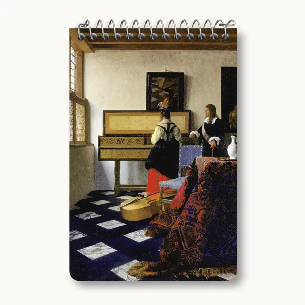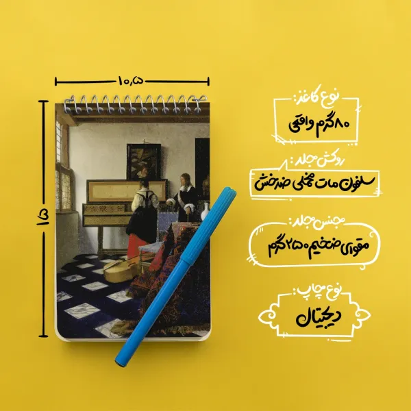 برند خندالو در زمینه تولید انواع دفاتر فانتزی و تحصیلی فعالیت میکند که به دلیل جذابیت ظاهری و طرح های متنوع طرفداران زیادی دارد. دفتر یادداشت خندالو طرح نقاشی کلاس موسیقی اثر یوهانس فرمیر محصولی مناسب برای همه عاشقان لوازم التحریر است و همچنین همه کسانی که بنا به موقعیت تحصیل یا شغلشان با دفتر و نوشت افزار زیاد سر و کار دارند. در تولید دفتر یادداشت خندالو طرح نقاشی کلاس موسیقی اثر یوهانس فرمیر از نوع صحافی فنر مارپیچ استفاده شده که در این نوع صحافی برگهها به راحتی چرخیده و یا بیرون آورده می شوند. دفتر های خندالو دارای جلد انعطاف پذیر از جنس مقوای گلاسه 250 گرم با روکش سلفون مات مخملی است که به شما امکان میدهد از دفتر خود بدون اینکه نگرانی از شکستن یا خراب شدن جلد را داشته باشید استفاده کنید و همچنین در این دفاتر از کاغذ 80 گرم با کیفیت استفاده شده که باعث میشود هنگام نوشتن به خوبی جوهر قلم بر روی صفحه نشسته و از خط خوردگیها جلوگیری کند. دفتر یادداشت خندالو با جنس و دوام مناسب، برگه های کاملاً سفید و خطوط طوسی دقیق را داراست که انسان را به نوشتن منظم و زیبا ترغیب میکند. طراحی کاملاً مناسب این دفاتر، به همراه کیفیت بالا، از آن یک محصول مورد علاقه و قابل اعتماد برای همه مقاطع تحصیلی میسازد. دفتر یادداشت خندالو طرح نقاشی کلاس موسیقی اثر یوهانس فرمیر انتخابی هوشمندانه و مناسب برای افرادی است که به دنبال دفتری با کیفیت و کاربرد عالی هستند. این دفتر، همراه خوبی برای شما در تمام مراحل تحصیل و کار خواهد بود و تجربهای لذتبخش از نوشتن و آموختن را به شما هدیه میدهد.