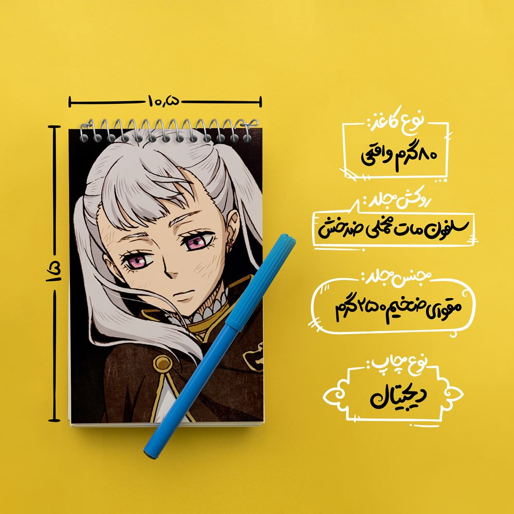 برند خندالو در زمینه تولید انواع دفاتر فانتزی و تحصیلی فعالیت میکند که به دلیل جذابیت ظاهری و طرح های متنوع طرفداران زیادی دارد. دفتر یادداشت خندالو طرح نوئل سیلوا انیمه بلک کلاور Black Clover محصولی مناسب برای همه عاشقان لوازم التحریر است و همچنین همه کسانی که بنا به موقعیت تحصیل یا شغلشان با دفتر و نوشت افزار زیاد سر و کار دارند. در تولید دفتر یادداشت خندالو طرح نوئل سیلوا انیمه بلک کلاور Black Clover از نوع صحافی فنر مارپیچ استفاده شده که در این نوع صحافی برگهها به راحتی چرخیده و یا بیرون آورده می شوند. دفتر های خندالو دارای جلد انعطاف پذیر از جنس مقوای گلاسه 250 گرم با روکش سلفون مات مخملی است که به شما امکان میدهد از دفتر خود بدون اینکه نگرانی از شکستن یا خراب شدن جلد را داشته باشید استفاده کنید و همچنین در این دفاتر از کاغذ 80 گرم با کیفیت استفاده شده که باعث میشود هنگام نوشتن به خوبی جوهر قلم بر روی صفحه نشسته و از خط خوردگیها جلوگیری کند. دفتر یادداشت خندالو با جنس و دوام مناسب، برگه های کاملاً سفید و خطوط طوسی دقیق را داراست که انسان را به نوشتن منظم و زیبا ترغیب میکند. طراحی کاملاً مناسب این دفاتر، به همراه کیفیت بالا، از آن یک محصول مورد علاقه و قابل اعتماد برای همه مقاطع تحصیلی میسازد. دفتر یادداشت خندالو طرح نوئل سیلوا انیمه بلک کلاور Black Clover انتخابی هوشمندانه و مناسب برای افرادی است که به دنبال دفتری با کیفیت و کاربرد عالی هستند. این دفتر، همراه خوبی برای شما در تمام مراحل تحصیل و کار خواهد بود و تجربهای لذتبخش از نوشتن و آموختن را به شما هدیه میدهد.