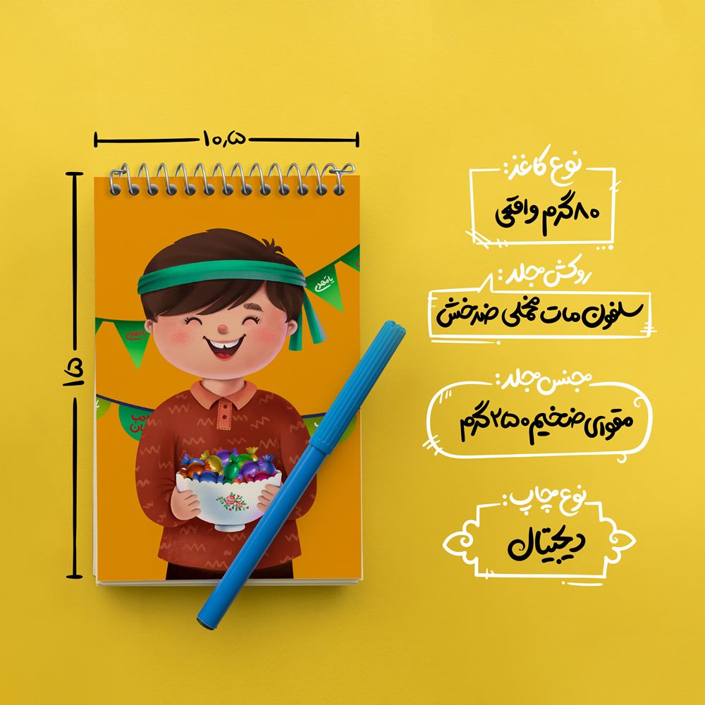 برند خندالو در زمینه تولید انواع دفاتر فانتزی و تحصیلی فعالیت میکند که به دلیل جذابیت ظاهری و طرح های متنوع طرفداران زیادی دارد. دفتر یادداشت خندالو طرح نیمه شعبان کودکانه محصولی مناسب برای همه عاشقان لوازم التحریر است و همچنین همه کسانی که بنا به موقعیت تحصیل یا شغلشان با دفتر و نوشت افزار زیاد سر و کار دارند. در تولید دفتر یادداشت خندالو طرح نیمه شعبان کودکانه از نوع صحافی فنر مارپیچ استفاده شده که در این نوع صحافی برگه‌ها به راحتی چرخیده و یا بیرون آورده می شوند.