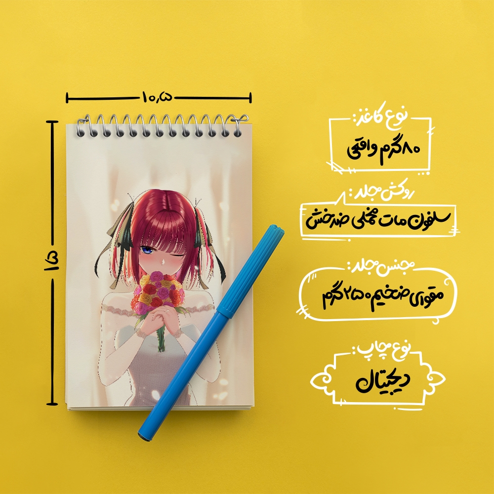 برند خندالو در زمینه تولید انواع دفاتر فانتزی و تحصیلی فعالیت میکند که به دلیل جذابیت ظاهری و طرح های متنوع طرفداران زیادی دارد. دفتر یادداشت خندالو طرح نینو انیمه پنج عروس مساوی محصولی مناسب برای همه عاشقان لوازم التحریر است و همچنین همه کسانی که بنا به موقعیت تحصیل یا شغلشان با دفتر و نوشت افزار زیاد سر و کار دارند. در تولید دفتر یادداشت خندالو طرح نینو انیمه پنج عروس مساوی از نوع صحافی فنر مارپیچ استفاده شده که در این نوع صحافی برگهها به راحتی چرخیده و یا بیرون آورده می شوند. دفتر های خندالو دارای جلد انعطاف پذیر از جنس مقوای گلاسه 250 گرم با روکش سلفون مات مخملی است که به شما امکان میدهد از دفتر خود بدون اینکه نگرانی از شکستن یا خراب شدن جلد را داشته باشید استفاده کنید و همچنین در این دفاتر از کاغذ 80 گرم با کیفیت استفاده شده که باعث میشود هنگام نوشتن به خوبی جوهر قلم بر روی صفحه نشسته و از خط خوردگیها جلوگیری کند. دفتر یادداشت خندالو با جنس و دوام مناسب، برگه های کاملاً سفید و خطوط طوسی دقیق را داراست که انسان را به نوشتن منظم و زیبا ترغیب میکند. طراحی کاملاً مناسب این دفاتر، به همراه کیفیت بالا، از آن یک محصول مورد علاقه و قابل اعتماد برای همه مقاطع تحصیلی میسازد. دفتر یادداشت خندالو طرح نینو انیمه پنج عروس مساوی انتخابی هوشمندانه و مناسب برای افرادی است که به دنبال دفتری با کیفیت و کاربرد عالی هستند. این دفتر، همراه خوبی برای شما در تمام مراحل تحصیل و کار خواهد بود و تجربهای لذتبخش از نوشتن و آموختن را به شما هدیه میدهد.