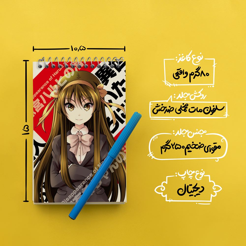 برند خندالو در زمینه تولید انواع دفاتر فانتزی و تحصیلی فعالیت میکند که به دلیل جذابیت ظاهری و طرح های متنوع طرفداران زیادی دارد. دفتر یادداشت خندالو طرح هاروهی انیمه ناپدید شدن هارومی سوزومیا The Disappearance of Haruhi Suzumiya محصولی مناسب برای همه عاشقان لوازم التحریر است و همچنین همه کسانی که بنا به موقعیت تحصیل یا شغلشان با دفتر و نوشت افزار زیاد سر و کار دارند. در تولید دفتر یادداشت خندالو طرح هاروهی انیمه ناپدید شدن هارومی سوزومیا The Disappearance of Haruhi Suzumiya از نوع صحافی فنر مارپیچ استفاده شده که در این نوع صحافی برگه‌ها به راحتی چرخیده و یا بیرون آورده می شوند.
