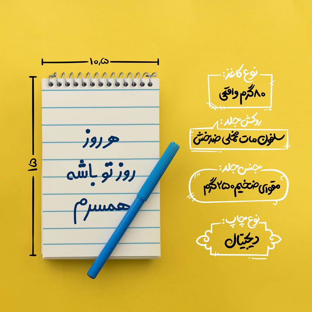 برند خندالو در زمینه تولید انواع دفاتر فانتزی و تحصیلی فعالیت میکند که به دلیل جذابیت ظاهری و طرح های متنوع طرفداران زیادی دارد. دفتر یادداشت خندالو طرح هرروز روز تو باشه همسرم محصولی مناسب برای همه عاشقان لوازم التحریر است و همچنین همه کسانی که بنا به موقعیت تحصیل یا شغلشان با دفتر و نوشت افزار زیاد سر و کار دارند. در تولید دفتر یادداشت خندالو طرح هرروز روز تو باشه همسرم از نوع صحافی فنر مارپیچ استفاده شده که در این نوع صحافی برگهها به راحتی چرخیده و یا بیرون آورده می شوند. دفتر های خندالو دارای جلد انعطاف پذیر از جنس مقوای گلاسه 250 گرم با روکش سلفون مات مخملی است که به شما امکان میدهد از دفتر خود بدون اینکه نگرانی از شکستن یا خراب شدن جلد را داشته باشید استفاده کنید و همچنین در این دفاتر از کاغذ 80 گرم با کیفیت استفاده شده که باعث میشود هنگام نوشتن به خوبی جوهر قلم بر روی صفحه نشسته و از خط خوردگیها جلوگیری کند. دفتر یادداشت خندالو با جنس و دوام مناسب، برگه های کاملاً سفید و خطوط طوسی دقیق را داراست که انسان را به نوشتن منظم و زیبا ترغیب میکند. طراحی کاملاً مناسب این دفاتر، به همراه کیفیت بالا، از آن یک محصول مورد علاقه و قابل اعتماد برای همه مقاطع تحصیلی میسازد. دفتر یادداشت خندالو طرح هرروز روز تو باشه همسرم انتخابی هوشمندانه و مناسب برای افرادی است که به دنبال دفتری با کیفیت و کاربرد عالی هستند. این دفتر، همراه خوبی برای شما در تمام مراحل تحصیل و کار خواهد بود و تجربهای لذتبخش از نوشتن و آموختن را به شما هدیه میدهد.