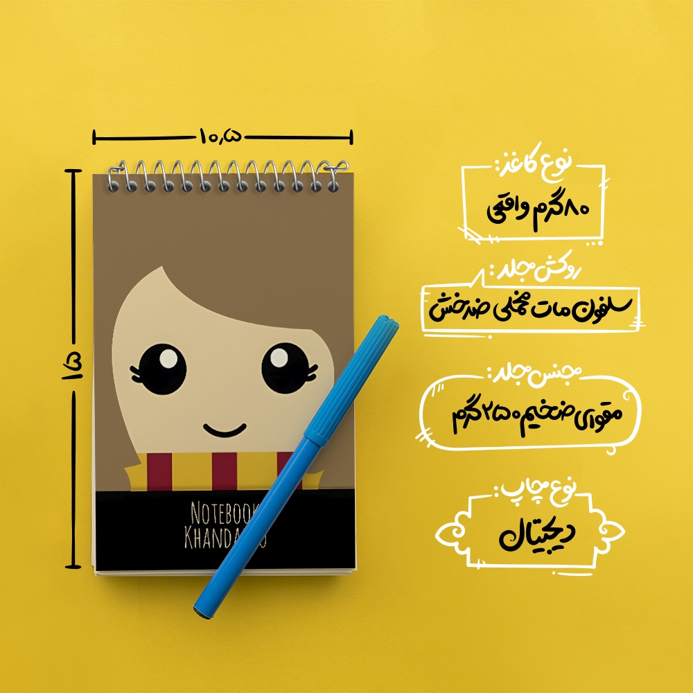 برند خندالو در زمینه تولید انواع دفاتر فانتزی و تحصیلی فعالیت میکند که به دلیل جذابیت ظاهری و طرح های متنوع طرفداران زیادی دارد. دفتر یادداشت خندالو طرح هرماینی هری پاتر (Harry Potter) محصولی مناسب برای همه عاشقان لوازم التحریر است و همچنین همه کسانی که بنا به موقعیت تحصیل یا شغلشان با دفتر و نوشت افزار زیاد سر و کار دارند. در تولید دفتر یادداشت خندالو طرح هرماینی هری پاتر (Harry Potter) از نوع صحافی فنر مارپیچ استفاده شده که در این نوع صحافی برگه‌ها به راحتی چرخیده و یا بیرون آورده می شوند.