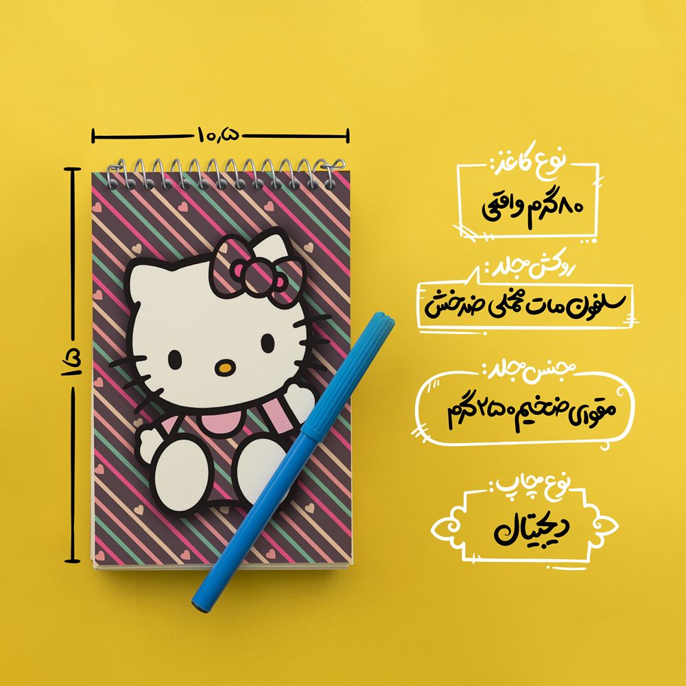 برند خندالو در زمینه تولید انواع دفاتر فانتزی و تحصیلی فعالیت میکند که به دلیل جذابیت ظاهری و طرح های متنوع طرفداران زیادی دارد. دفتر یادداشت خندالو طرح هلو کیتی Hello Kitty محصولی مناسب برای همه عاشقان لوازم التحریر است و همچنین همه کسانی که بنا به موقعیت تحصیل یا شغلشان با دفتر و نوشت افزار زیاد سر و کار دارند. در تولید دفتر یادداشت خندالو طرح هلو کیتی Hello Kitty از نوع صحافی فنر مارپیچ استفاده شده که در این نوع صحافی برگه‌ها به راحتی چرخیده و یا بیرون آورده می شوند.