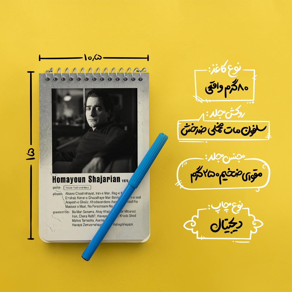 برند خندالو در زمینه تولید انواع دفاتر فانتزی و تحصیلی فعالیت میکند که به دلیل جذابیت ظاهری و طرح های متنوع طرفداران زیادی دارد. دفتر یادداشت خندالو طرح همایون شجریان محصولی مناسب برای همه عاشقان لوازم التحریر است و همچنین همه کسانی که بنا به موقعیت تحصیل یا شغلشان با دفتر و نوشت افزار زیاد سر و کار دارند. در تولید دفتر یادداشت خندالو طرح همایون شجریان از نوع صحافی فنر مارپیچ استفاده شده که در این نوع صحافی برگهها به راحتی چرخیده و یا بیرون آورده می شوند. دفتر های خندالو دارای جلد انعطاف پذیر از جنس مقوای گلاسه 250 گرم با روکش سلفون مات مخملی است که به شما امکان میدهد از دفتر خود بدون اینکه نگرانی از شکستن یا خراب شدن جلد را داشته باشید استفاده کنید و همچنین در این دفاتر از کاغذ 80 گرم با کیفیت استفاده شده که باعث میشود هنگام نوشتن به خوبی جوهر قلم بر روی صفحه نشسته و از خط خوردگیها جلوگیری کند. دفتر یادداشت خندالو با جنس و دوام مناسب، برگه های کاملاً سفید و خطوط طوسی دقیق را داراست که انسان را به نوشتن منظم و زیبا ترغیب میکند. طراحی کاملاً مناسب این دفاتر، به همراه کیفیت بالا، از آن یک محصول مورد علاقه و قابل اعتماد برای همه مقاطع تحصیلی میسازد. دفتر یادداشت خندالو طرح همایون شجریان انتخابی هوشمندانه و مناسب برای افرادی است که به دنبال دفتری با کیفیت و کاربرد عالی هستند. این دفتر، همراه خوبی برای شما در تمام مراحل تحصیل و کار خواهد بود و تجربهای لذتبخش از نوشتن و آموختن را به شما هدیه میدهد.