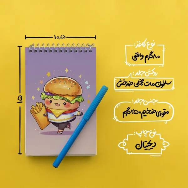 برند خندالو در زمینه تولید انواع دفاتر فانتزی و تحصیلی فعالیت میکند که به دلیل جذابیت ظاهری و طرح های متنوع طرفداران زیادی دارد. دفتر یادداشت خندالو طرح همبرگر توپولو محصولی مناسب برای همه عاشقان لوازم التحریر است و همچنین همه کسانی که بنا به موقعیت تحصیل یا شغلشان با دفتر و نوشت افزار زیاد سر و کار دارند. در تولید دفتر یادداشت خندالو طرح همبرگر توپولو از نوع صحافی فنر مارپیچ استفاده شده که در این نوع صحافی برگهها به راحتی چرخیده و یا بیرون آورده می شوند. دفتر های خندالو دارای جلد انعطاف پذیر از جنس مقوای گلاسه 250 گرم با روکش سلفون مات مخملی است که به شما امکان میدهد از دفتر خود بدون اینکه نگرانی از شکستن یا خراب شدن جلد را داشته باشید استفاده کنید و همچنین در این دفاتر از کاغذ 80 گرم با کیفیت استفاده شده که باعث میشود هنگام نوشتن به خوبی جوهر قلم بر روی صفحه نشسته و از خط خوردگیها جلوگیری کند. دفتر یادداشت خندالو با جنس و دوام مناسب، برگه های کاملاً سفید و خطوط طوسی دقیق را داراست که انسان را به نوشتن منظم و زیبا ترغیب میکند. طراحی کاملاً مناسب این دفاتر، به همراه کیفیت بالا، از آن یک محصول مورد علاقه و قابل اعتماد برای همه مقاطع تحصیلی میسازد. دفتر یادداشت خندالو طرح همبرگر توپولو انتخابی هوشمندانه و مناسب برای افرادی است که به دنبال دفتری با کیفیت و کاربرد عالی هستند. این دفتر، همراه خوبی برای شما در تمام مراحل تحصیل و کار خواهد بود و تجربهای لذتبخش از نوشتن و آموختن را به شما هدیه میدهد.