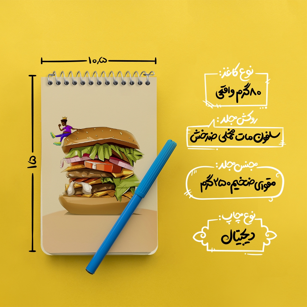 برند خندالو در زمینه تولید انواع دفاتر فانتزی و تحصیلی فعالیت میکند که به دلیل جذابیت ظاهری و طرح های متنوع طرفداران زیادی دارد. دفتر یادداشت خندالو طرح همبرگر محصولی مناسب برای همه عاشقان لوازم التحریر است و همچنین همه کسانی که بنا به موقعیت تحصیل یا شغلشان با دفتر و نوشت افزار زیاد سر و کار دارند. در تولید دفتر یادداشت خندالو طرح همبرگر از نوع صحافی فنر مارپیچ استفاده شده که در این نوع صحافی برگهها به راحتی چرخیده و یا بیرون آورده می شوند. دفتر های خندالو دارای جلد انعطاف پذیر از جنس مقوای گلاسه 250 گرم با روکش سلفون مات مخملی است که به شما امکان میدهد از دفتر خود بدون اینکه نگرانی از شکستن یا خراب شدن جلد را داشته باشید استفاده کنید و همچنین در این دفاتر از کاغذ 80 گرم با کیفیت استفاده شده که باعث میشود هنگام نوشتن به خوبی جوهر قلم بر روی صفحه نشسته و از خط خوردگیها جلوگیری کند. دفتر یادداشت خندالو با جنس و دوام مناسب، برگه های کاملاً سفید و خطوط طوسی دقیق را داراست که انسان را به نوشتن منظم و زیبا ترغیب میکند. طراحی کاملاً مناسب این دفاتر، به همراه کیفیت بالا، از آن یک محصول مورد علاقه و قابل اعتماد برای همه مقاطع تحصیلی میسازد. دفتر یادداشت خندالو طرح همبرگر انتخابی هوشمندانه و مناسب برای افرادی است که به دنبال دفتری با کیفیت و کاربرد عالی هستند. این دفتر، همراه خوبی برای شما در تمام مراحل تحصیل و کار خواهد بود و تجربهای لذتبخش از نوشتن و آموختن را به شما هدیه میدهد.