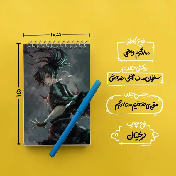 برند خندالو در زمینه تولید انواع دفاتر فانتزی و تحصیلی فعالیت میکند که به دلیل جذابیت ظاهری و طرح های متنوع طرفداران زیادی دارد. دفتر یادداشت خندالو طرح هیاکومارو انیمه دورورو Dororo محصولی مناسب برای همه عاشقان لوازم التحریر است و همچنین همه کسانی که بنا به موقعیت تحصیل یا شغلشان با دفتر و نوشت افزار زیاد سر و کار دارند. در تولید دفتر یادداشت خندالو طرح هیاکومارو انیمه دورورو Dororo از نوع صحافی فنر مارپیچ استفاده شده که در این نوع صحافی برگهها به راحتی چرخیده و یا بیرون آورده می شوند. دفتر های خندالو دارای جلد انعطاف پذیر از جنس مقوای گلاسه 250 گرم با روکش سلفون مات مخملی است که به شما امکان میدهد از دفتر خود بدون اینکه نگرانی از شکستن یا خراب شدن جلد را داشته باشید استفاده کنید و همچنین در این دفاتر از کاغذ 80 گرم با کیفیت استفاده شده که باعث میشود هنگام نوشتن به خوبی جوهر قلم بر روی صفحه نشسته و از خط خوردگیها جلوگیری کند. دفتر یادداشت خندالو با جنس و دوام مناسب، برگه های کاملاً سفید و خطوط طوسی دقیق را داراست که انسان را به نوشتن منظم و زیبا ترغیب میکند. طراحی کاملاً مناسب این دفاتر، به همراه کیفیت بالا، از آن یک محصول مورد علاقه و قابل اعتماد برای همه مقاطع تحصیلی میسازد. دفتر یادداشت خندالو طرح هیاکومارو انیمه دورورو Dororo انتخابی هوشمندانه و مناسب برای افرادی است که به دنبال دفتری با کیفیت و کاربرد عالی هستند. این دفتر، همراه خوبی برای شما در تمام مراحل تحصیل و کار خواهد بود و تجربهای لذتبخش از نوشتن و آموختن را به شما هدیه میدهد.