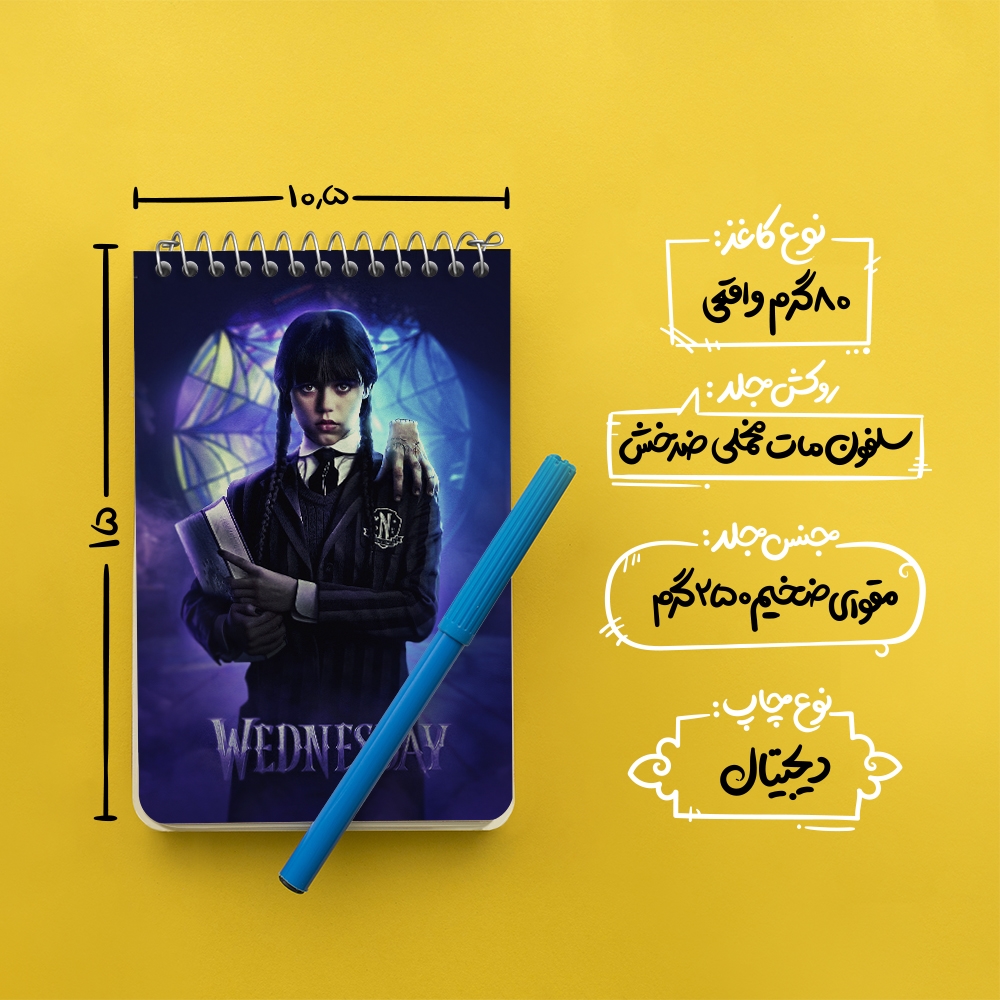 برند خندالو در زمینه تولید انواع دفاتر فانتزی و تحصیلی فعالیت میکند که به دلیل جذابیت ظاهری و طرح های متنوع طرفداران زیادی دارد. دفتر یادداشت خندالو طرح ونزدی (Wednesday) محصولی مناسب برای همه عاشقان لوازم التحریر است و همچنین همه کسانی که بنا به موقعیت تحصیل یا شغلشان با دفتر و نوشت افزار زیاد سر و کار دارند. در تولید دفتر یادداشت خندالو طرح ونزدی (Wednesday) از نوع صحافی فنر مارپیچ استفاده شده که در این نوع صحافی برگه‌ها به راحتی چرخیده و یا بیرون آورده می شوند.