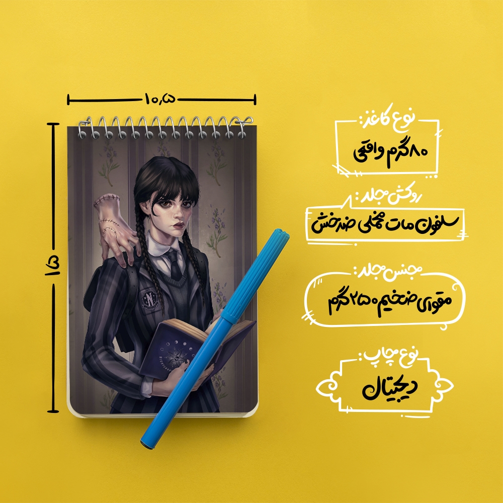 برند خندالو در زمینه تولید انواع دفاتر فانتزی و تحصیلی فعالیت میکند که به دلیل جذابیت ظاهری و طرح های متنوع طرفداران زیادی دارد. دفتر یادداشت خندالو طرح ونزدی (Wednesday) محصولی مناسب برای همه عاشقان لوازم التحریر است و همچنین همه کسانی که بنا به موقعیت تحصیل یا شغلشان با دفتر و نوشت افزار زیاد سر و کار دارند. در تولید دفتر یادداشت خندالو طرح ونزدی (Wednesday) از نوع صحافی فنر مارپیچ استفاده شده که در این نوع صحافی برگه‌ها به راحتی چرخیده و یا بیرون آورده می شوند.