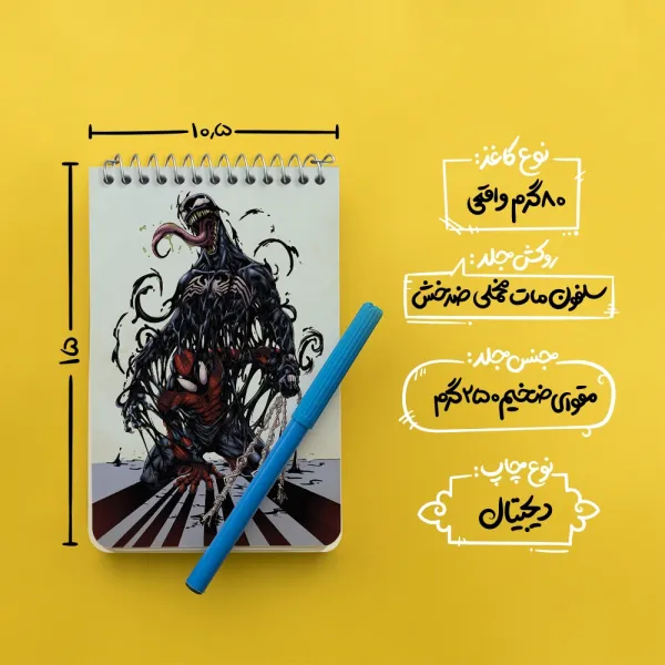 برند خندالو در زمینه تولید انواع دفاتر فانتزی و تحصیلی فعالیت میکند که به دلیل جذابیت ظاهری و طرح های متنوع طرفداران زیادی دارد. دفتر یادداشت خندالو طرح ونوم و مرد عنکبوتی محصولی مناسب برای همه عاشقان لوازم التحریر است و همچنین همه کسانی که بنا به موقعیت تحصیل یا شغلشان با دفتر و نوشت افزار زیاد سر و کار دارند. در تولید دفتر یادداشت خندالو طرح ونوم و مرد عنکبوتی از نوع صحافی فنر مارپیچ استفاده شده که در این نوع صحافی برگهها به راحتی چرخیده و یا بیرون آورده می شوند. دفتر های خندالو دارای جلد انعطاف پذیر از جنس مقوای گلاسه 250 گرم با روکش سلفون مات مخملی است که به شما امکان میدهد از دفتر خود بدون اینکه نگرانی از شکستن یا خراب شدن جلد را داشته باشید استفاده کنید و همچنین در این دفاتر از کاغذ 80 گرم با کیفیت استفاده شده که باعث میشود هنگام نوشتن به خوبی جوهر قلم بر روی صفحه نشسته و از خط خوردگیها جلوگیری کند. دفتر یادداشت خندالو با جنس و دوام مناسب، برگه های کاملاً سفید و خطوط طوسی دقیق را داراست که انسان را به نوشتن منظم و زیبا ترغیب میکند. طراحی کاملاً مناسب این دفاتر، به همراه کیفیت بالا، از آن یک محصول مورد علاقه و قابل اعتماد برای همه مقاطع تحصیلی میسازد. دفتر یادداشت خندالو طرح ونوم و مرد عنکبوتی انتخابی هوشمندانه و مناسب برای افرادی است که به دنبال دفتری با کیفیت و کاربرد عالی هستند. این دفتر، همراه خوبی برای شما در تمام مراحل تحصیل و کار خواهد بود و تجربهای لذتبخش از نوشتن و آموختن را به شما هدیه میدهد.
