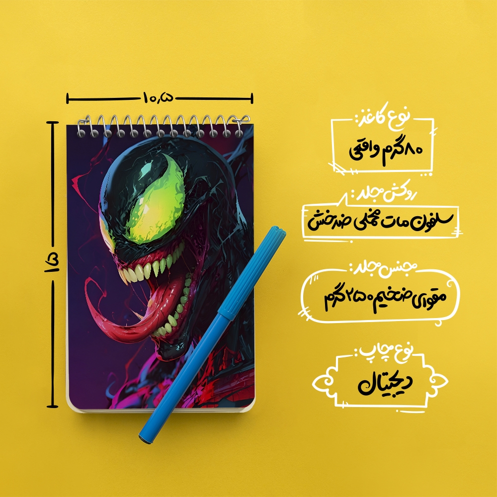 برند خندالو در زمینه تولید انواع دفاتر فانتزی و تحصیلی فعالیت میکند که به دلیل جذابیت ظاهری و طرح های متنوع طرفداران زیادی دارد. دفتر یادداشت خندالو طرح ونوم (Venom) محصولی مناسب برای همه عاشقان لوازم التحریر است و همچنین همه کسانی که بنا به موقعیت تحصیل یا شغلشان با دفتر و نوشت افزار زیاد سر و کار دارند. در تولید دفتر یادداشت خندالو طرح ونوم (Venom) از نوع صحافی فنر مارپیچ استفاده شده که در این نوع صحافی برگهها به راحتی چرخیده و یا بیرون آورده می شوند. دفتر های خندالو دارای جلد انعطاف پذیر از جنس مقوای گلاسه 250 گرم با روکش سلفون مات مخملی است که به شما امکان میدهد از دفتر خود بدون اینکه نگرانی از شکستن یا خراب شدن جلد را داشته باشید استفاده کنید و همچنین در این دفاتر از کاغذ 80 گرم با کیفیت استفاده شده که باعث میشود هنگام نوشتن به خوبی جوهر قلم بر روی صفحه نشسته و از خط خوردگیها جلوگیری کند. دفتر یادداشت خندالو با جنس و دوام مناسب، برگه های کاملاً سفید و خطوط طوسی دقیق را داراست که انسان را به نوشتن منظم و زیبا ترغیب میکند. طراحی کاملاً مناسب این دفاتر، به همراه کیفیت بالا، از آن یک محصول مورد علاقه و قابل اعتماد برای همه مقاطع تحصیلی میسازد. دفتر یادداشت خندالو طرح ونوم (Venom) انتخابی هوشمندانه و مناسب برای افرادی است که به دنبال دفتری با کیفیت و کاربرد عالی هستند. این دفتر، همراه خوبی برای شما در تمام مراحل تحصیل و کار خواهد بود و تجربهای لذتبخش از نوشتن و آموختن را به شما هدیه میدهد.