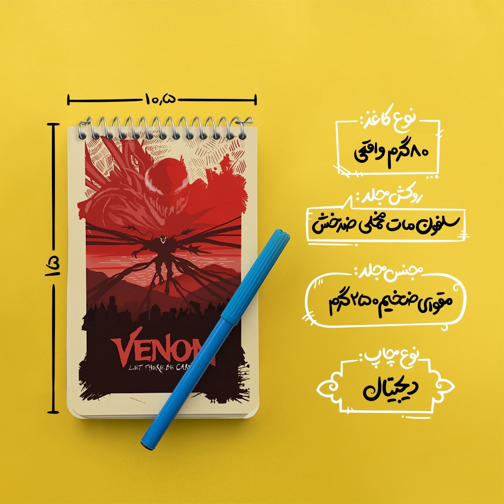 برند خندالو در زمینه تولید انواع دفاتر فانتزی و تحصیلی فعالیت میکند که به دلیل جذابیت ظاهری و طرح های متنوع طرفداران زیادی دارد. دفتر یادداشت خندالو طرح ونوم (Venom) محصولی مناسب برای همه عاشقان لوازم التحریر است و همچنین همه کسانی که بنا به موقعیت تحصیل یا شغلشان با دفتر و نوشت افزار زیاد سر و کار دارند. در تولید دفتر یادداشت خندالو طرح ونوم (Venom) از نوع صحافی فنر مارپیچ استفاده شده که در این نوع صحافی برگه‌ها به راحتی چرخیده و یا بیرون آورده می شوند.