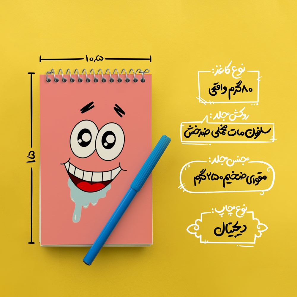 برند خندالو در زمینه تولید انواع دفاتر فانتزی و تحصیلی فعالیت میکند که به دلیل جذابیت ظاهری و طرح های متنوع طرفداران زیادی دارد. دفتر یادداشت خندالو طرح پاتریک باب اسفنجی محصولی مناسب برای همه عاشقان لوازم التحریر است و همچنین همه کسانی که بنا به موقعیت تحصیل یا شغلشان با دفتر و نوشت افزار زیاد سر و کار دارند. در تولید دفتر یادداشت خندالو طرح پاتریک باب اسفنجی از نوع صحافی فنر مارپیچ استفاده شده که در این نوع صحافی برگه‌ها به راحتی چرخیده و یا بیرون آورده می شوند.