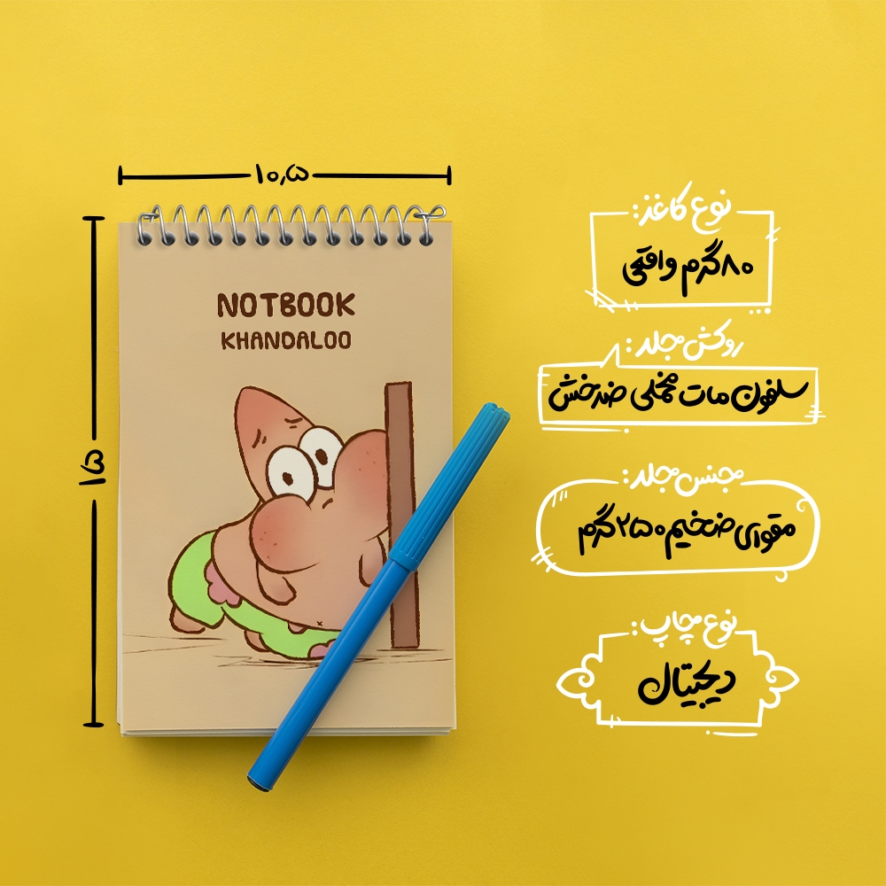 برند خندالو در زمینه تولید انواع دفاتر فانتزی و تحصیلی فعالیت میکند که به دلیل جذابیت ظاهری و طرح های متنوع طرفداران زیادی دارد. دفتر یادداشت خندالو طرح پاتریک محصولی مناسب برای همه عاشقان لوازم التحریر است و همچنین همه کسانی که بنا به موقعیت تحصیل یا شغلشان با دفتر و نوشت افزار زیاد سر و کار دارند. در تولید دفتر یادداشت خندالو طرح پاتریک از نوع صحافی فنر مارپیچ استفاده شده که در این نوع صحافی برگهها به راحتی چرخیده و یا بیرون آورده می شوند. دفتر های خندالو دارای جلد انعطاف پذیر از جنس مقوای گلاسه 250 گرم با روکش سلفون مات مخملی است که به شما امکان میدهد از دفتر خود بدون اینکه نگرانی از شکستن یا خراب شدن جلد را داشته باشید استفاده کنید و همچنین در این دفاتر از کاغذ 80 گرم با کیفیت استفاده شده که باعث میشود هنگام نوشتن به خوبی جوهر قلم بر روی صفحه نشسته و از خط خوردگیها جلوگیری کند. دفتر یادداشت خندالو با جنس و دوام مناسب، برگه های کاملاً سفید و خطوط طوسی دقیق را داراست که انسان را به نوشتن منظم و زیبا ترغیب میکند. طراحی کاملاً مناسب این دفاتر، به همراه کیفیت بالا، از آن یک محصول مورد علاقه و قابل اعتماد برای همه مقاطع تحصیلی میسازد. دفتر یادداشت خندالو طرح پاتریک انتخابی هوشمندانه و مناسب برای افرادی است که به دنبال دفتری با کیفیت و کاربرد عالی هستند. این دفتر، همراه خوبی برای شما در تمام مراحل تحصیل و کار خواهد بود و تجربهای لذتبخش از نوشتن و آموختن را به شما هدیه میدهد.