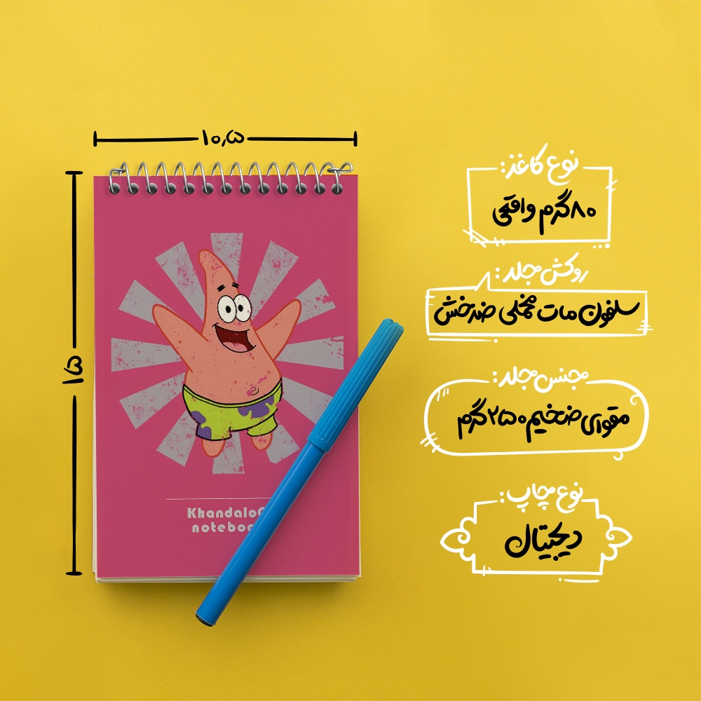 برند خندالو در زمینه تولید انواع دفاتر فانتزی و تحصیلی فعالیت میکند که به دلیل جذابیت ظاهری و طرح های متنوع طرفداران زیادی دارد. دفتر یادداشت خندالو طرح پاتریک محصولی مناسب برای همه عاشقان لوازم التحریر است و همچنین همه کسانی که بنا به موقعیت تحصیل یا شغلشان با دفتر و نوشت افزار زیاد سر و کار دارند. در تولید دفتر یادداشت خندالو طرح پاتریک از نوع صحافی فنر مارپیچ استفاده شده که در این نوع صحافی برگه‌ها به راحتی چرخیده و یا بیرون آورده می شوند.