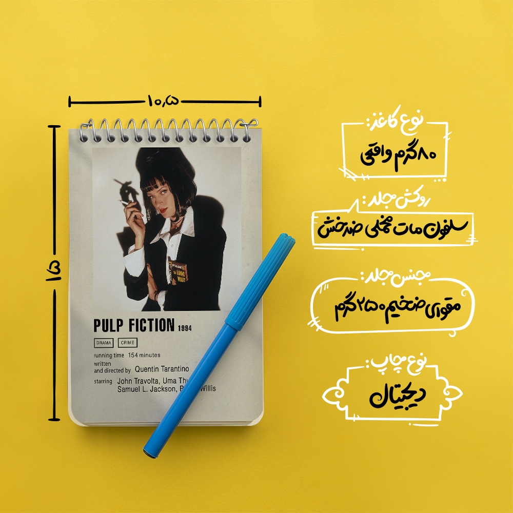 برند خندالو در زمینه تولید انواع دفاتر فانتزی و تحصیلی فعالیت میکند که به دلیل جذابیت ظاهری و طرح های متنوع طرفداران زیادی دارد. دفتر یادداشت خندالو طرح پالپ فیکشن (Pulp Fiction) محصولی مناسب برای همه عاشقان لوازم التحریر است و همچنین همه کسانی که بنا به موقعیت تحصیل یا شغلشان با دفتر و نوشت افزار زیاد سر و کار دارند. در تولید دفتر یادداشت خندالو طرح پالپ فیکشن (Pulp Fiction) از نوع صحافی فنر مارپیچ استفاده شده که در این نوع صحافی برگهها به راحتی چرخیده و یا بیرون آورده می شوند. دفتر های خندالو دارای جلد انعطاف پذیر از جنس مقوای گلاسه 250 گرم با روکش سلفون مات مخملی است که به شما امکان میدهد از دفتر خود بدون اینکه نگرانی از شکستن یا خراب شدن جلد را داشته باشید استفاده کنید و همچنین در این دفاتر از کاغذ 80 گرم با کیفیت استفاده شده که باعث میشود هنگام نوشتن به خوبی جوهر قلم بر روی صفحه نشسته و از خط خوردگیها جلوگیری کند. دفتر یادداشت خندالو با جنس و دوام مناسب، برگه های کاملاً سفید و خطوط طوسی دقیق را داراست که انسان را به نوشتن منظم و زیبا ترغیب میکند. طراحی کاملاً مناسب این دفاتر، به همراه کیفیت بالا، از آن یک محصول مورد علاقه و قابل اعتماد برای همه مقاطع تحصیلی میسازد. دفتر یادداشت خندالو طرح پالپ فیکشن (Pulp Fiction) انتخابی هوشمندانه و مناسب برای افرادی است که به دنبال دفتری با کیفیت و کاربرد عالی هستند. این دفتر، همراه خوبی برای شما در تمام مراحل تحصیل و کار خواهد بود و تجربهای لذتبخش از نوشتن و آموختن را به شما هدیه میدهد.
