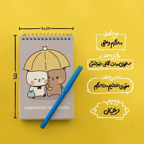 برند خندالو در زمینه تولید انواع دفاتر فانتزی و تحصیلی فعالیت میکند که به دلیل جذابیت ظاهری و طرح های متنوع طرفداران زیادی دارد. دفتر یادداشت خندالو طرح پاندا و خرس بامزه محصولی مناسب برای همه عاشقان لوازم التحریر است و همچنین همه کسانی که بنا به موقعیت تحصیل یا شغلشان با دفتر و نوشت افزار زیاد سر و کار دارند. در تولید دفتر یادداشت خندالو طرح پاندا و خرس بامزه از نوع صحافی فنر مارپیچ استفاده شده که در این نوع صحافی برگه‌ها به راحتی چرخیده و یا بیرون آورده می شوند.