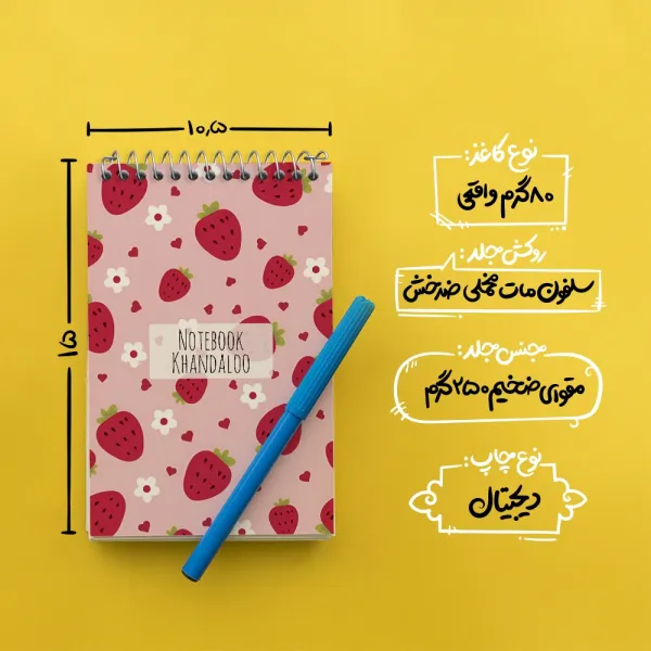 برند خندالو در زمینه تولید انواع دفاتر فانتزی و تحصیلی فعالیت میکند که به دلیل جذابیت ظاهری و طرح های متنوع طرفداران زیادی دارد. دفتر یادداشت خندالو طرح پترن توت فرنگی محصولی مناسب برای همه عاشقان لوازم التحریر است و همچنین همه کسانی که بنا به موقعیت تحصیل یا شغلشان با دفتر و نوشت افزار زیاد سر و کار دارند. در تولید دفتر یادداشت خندالو طرح پترن توت فرنگی از نوع صحافی فنر مارپیچ استفاده شده که در این نوع صحافی برگه‌ها به راحتی چرخیده و یا بیرون آورده می شوند.
