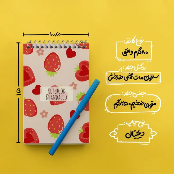 برند خندالو در زمینه تولید انواع دفاتر فانتزی و تحصیلی فعالیت میکند که به دلیل جذابیت ظاهری و طرح های متنوع طرفداران زیادی دارد. دفتر یادداشت خندالو طرح پترن توت فرنگی محصولی مناسب برای همه عاشقان لوازم التحریر است و همچنین همه کسانی که بنا به موقعیت تحصیل یا شغلشان با دفتر و نوشت افزار زیاد سر و کار دارند. در تولید دفتر یادداشت خندالو طرح پترن توت فرنگی از نوع صحافی فنر مارپیچ استفاده شده که در این نوع صحافی برگه‌ها به راحتی چرخیده و یا بیرون آورده می شوند.