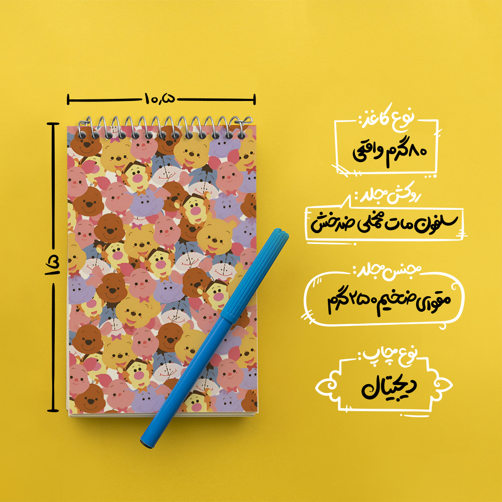 برند خندالو در زمینه تولید انواع دفاتر فانتزی و تحصیلی فعالیت میکند که به دلیل جذابیت ظاهری و طرح های متنوع طرفداران زیادی دارد. دفتر یادداشت خندالو طرح پترن خرس پو محصولی مناسب برای همه عاشقان لوازم التحریر است و همچنین همه کسانی که بنا به موقعیت تحصیل یا شغلشان با دفتر و نوشت افزار زیاد سر و کار دارند. در تولید دفتر یادداشت خندالو طرح پترن خرس پو از نوع صحافی فنر مارپیچ استفاده شده که در این نوع صحافی برگهها به راحتی چرخیده و یا بیرون آورده می شوند. دفتر های خندالو دارای جلد انعطاف پذیر از جنس مقوای گلاسه 250 گرم با روکش سلفون مات مخملی است که به شما امکان میدهد از دفتر خود بدون اینکه نگرانی از شکستن یا خراب شدن جلد را داشته باشید استفاده کنید و همچنین در این دفاتر از کاغذ 80 گرم با کیفیت استفاده شده که باعث میشود هنگام نوشتن به خوبی جوهر قلم بر روی صفحه نشسته و از خط خوردگیها جلوگیری کند. دفتر یادداشت خندالو با جنس و دوام مناسب، برگه های کاملاً سفید و خطوط طوسی دقیق را داراست که انسان را به نوشتن منظم و زیبا ترغیب میکند. طراحی کاملاً مناسب این دفاتر، به همراه کیفیت بالا، از آن یک محصول مورد علاقه و قابل اعتماد برای همه مقاطع تحصیلی میسازد. دفتر یادداشت خندالو طرح پترن خرس پو انتخابی هوشمندانه و مناسب برای افرادی است که به دنبال دفتری با کیفیت و کاربرد عالی هستند. این دفتر، همراه خوبی برای شما در تمام مراحل تحصیل و کار خواهد بود و تجربهای لذتبخش از نوشتن و آموختن را به شما هدیه میدهد.